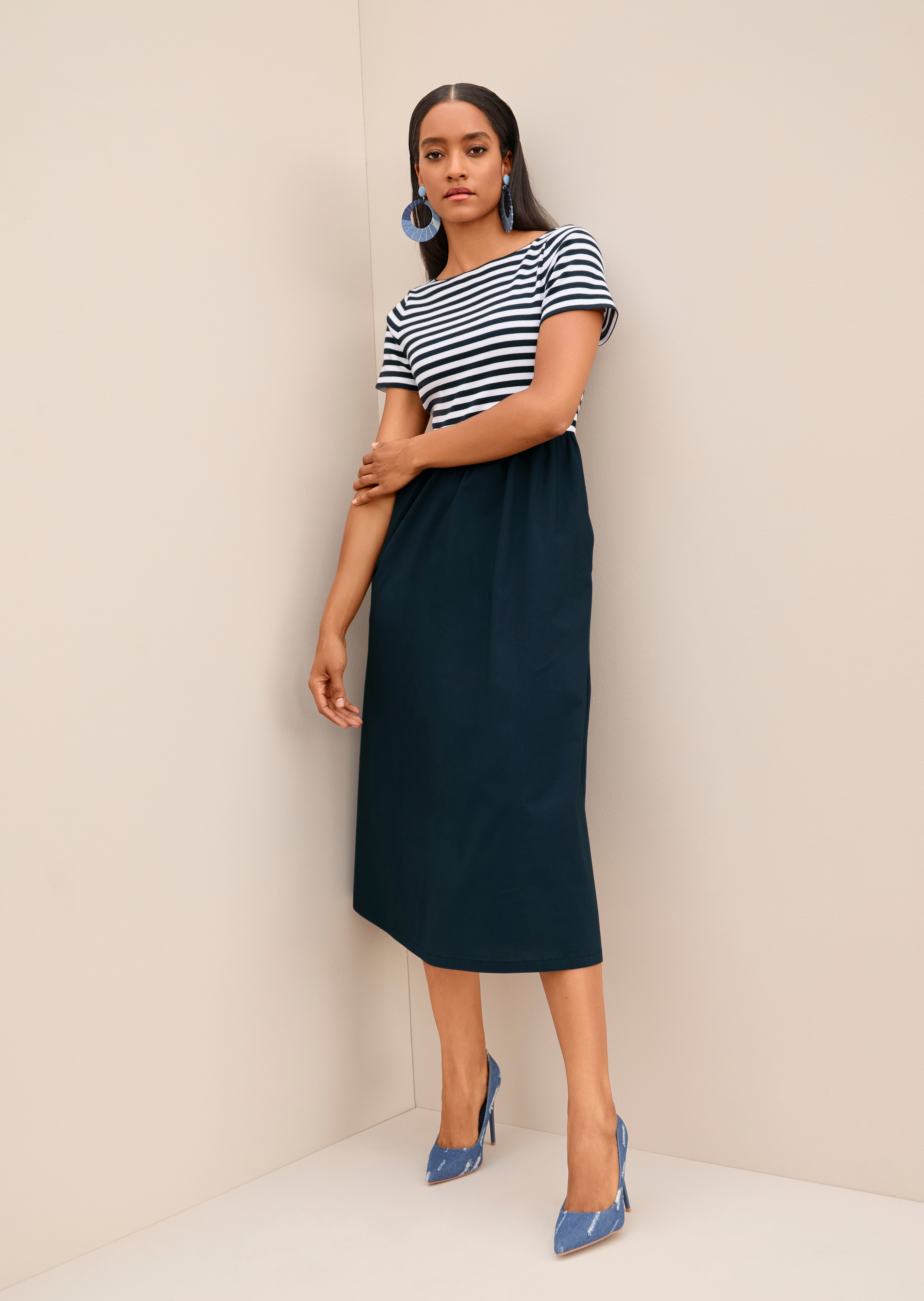 Idéale pour les belles journées d'été. Haut ajusté en jersey à motif rayé et jupe évasée unie en coton stretch lisse. Poches côtés dans les coutures, manches courtes et base droite.