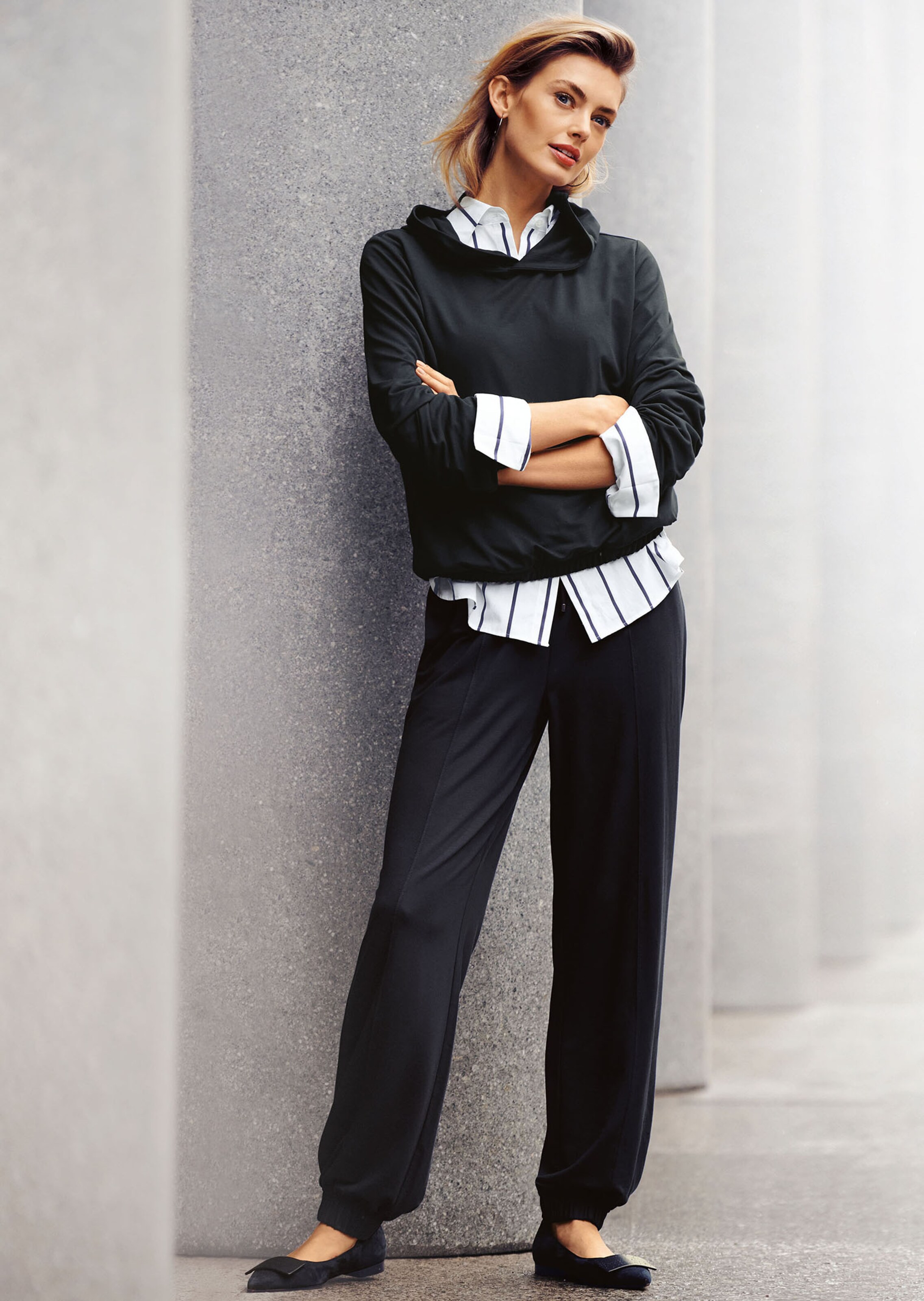 Coupe boxy avec capuche, manches longues, épaules légèrement descendues et bords extensibles.