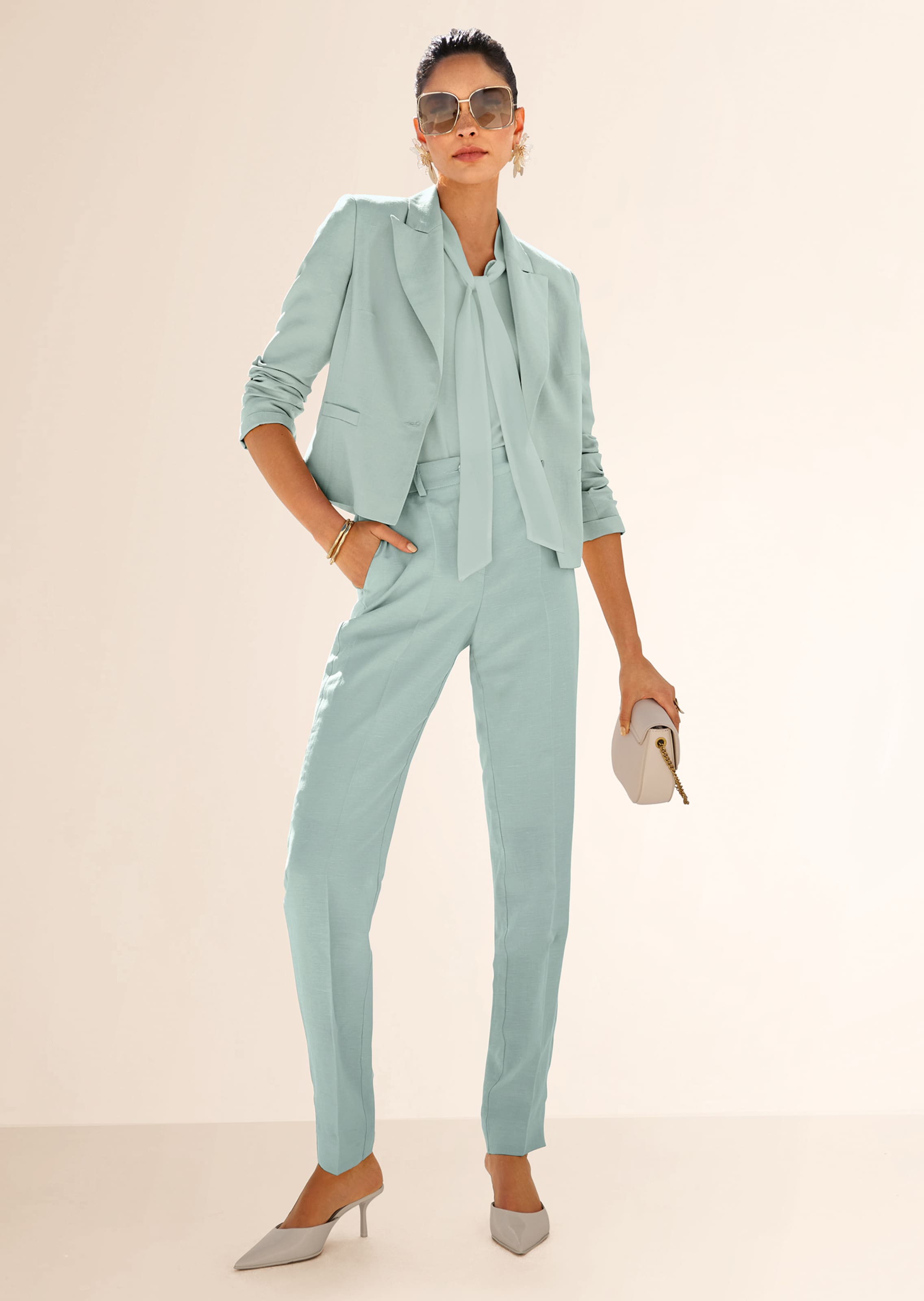 En jersey souple avec lavallière en tissu, fixée sur l'encolure arrondie. Coupe ajustée. Épaules légèrement froncées et manches courtes.