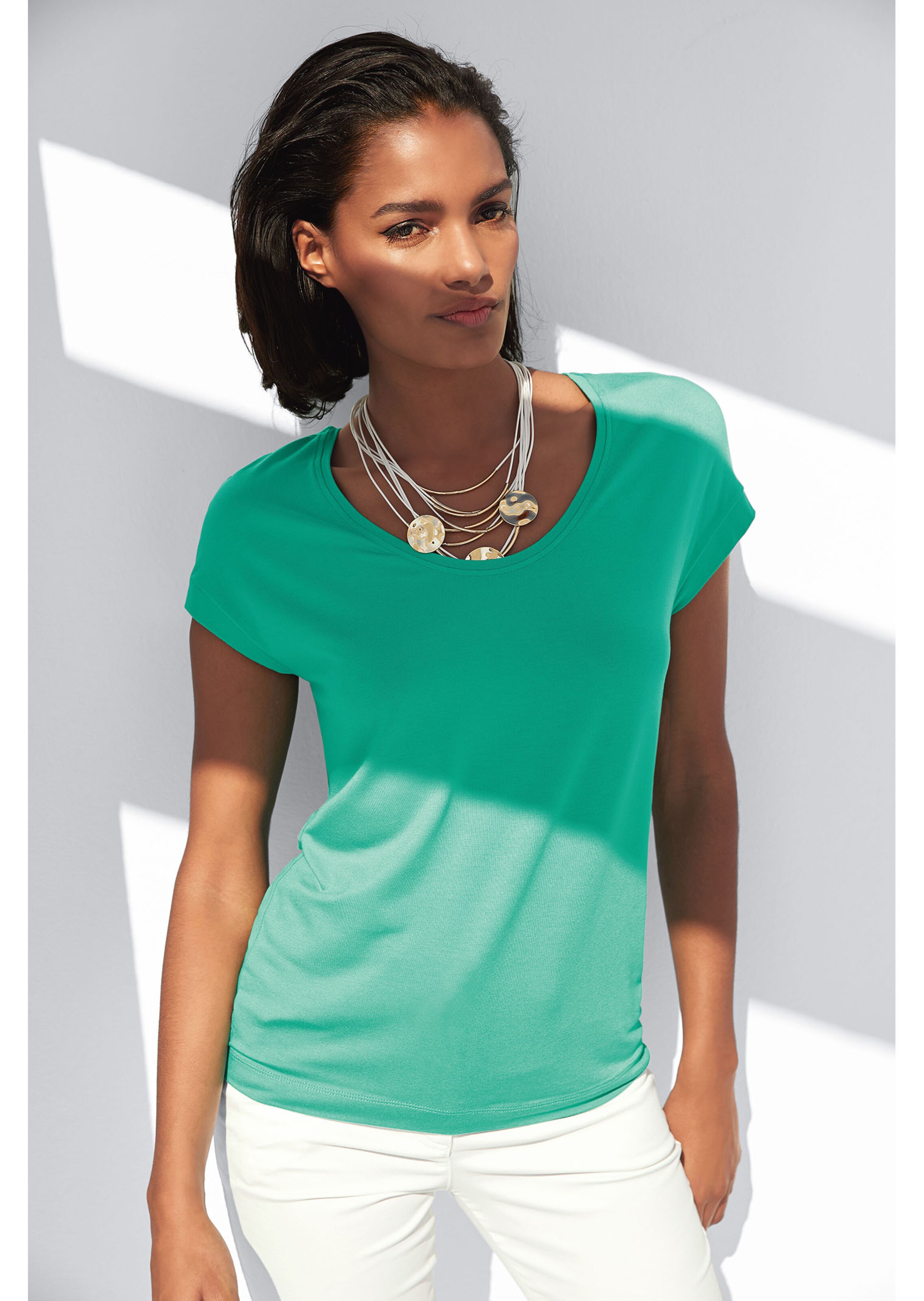 Modèle polyvalent haut de gamme en jersey stretch. Épaules descendues et encolure arrondie passepoilée.