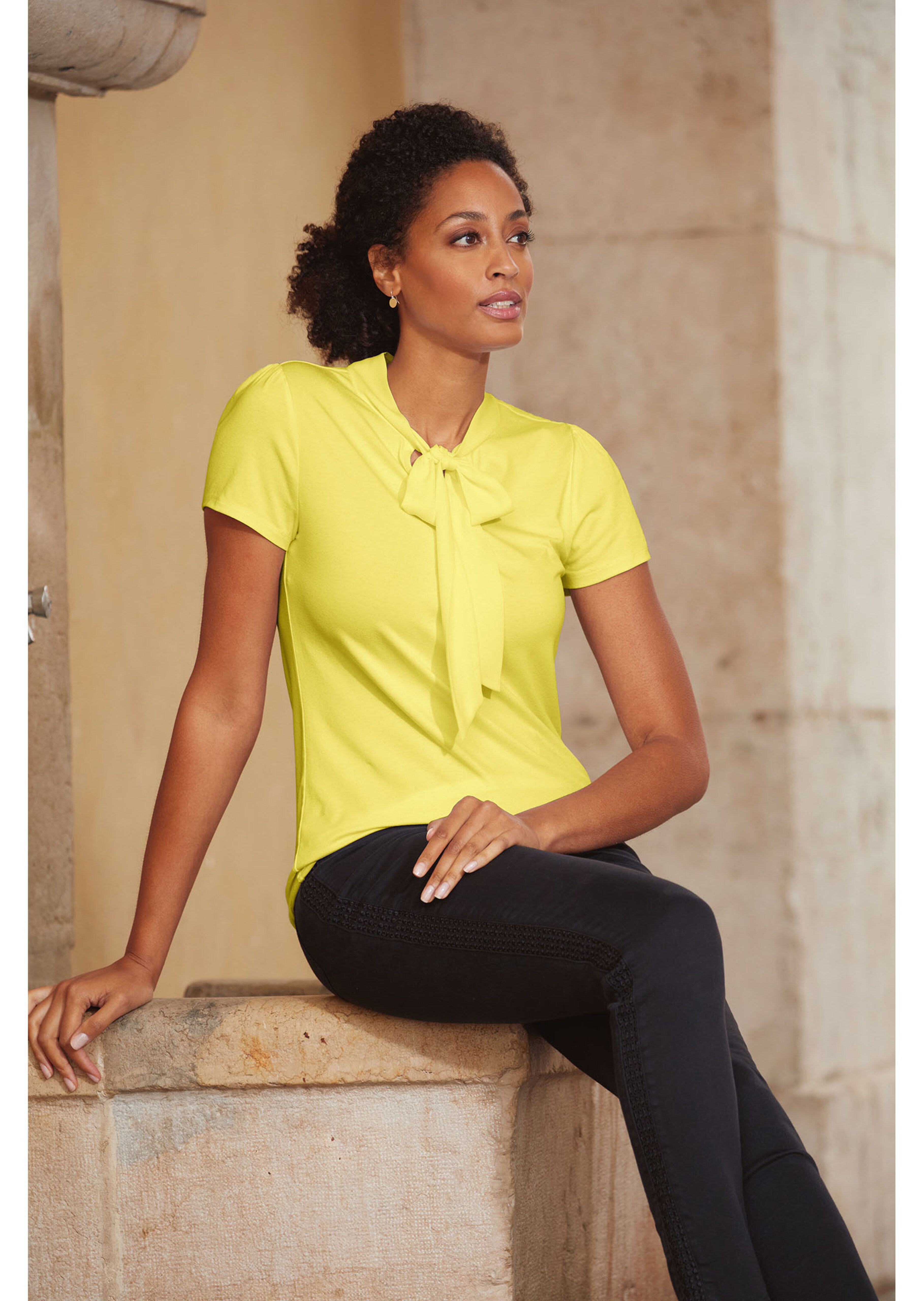 En jersey souple avec lavallière en tissu, fixée sur l'encolure arrondie. Coupe ajustée. Épaules légèrement froncées et manches courtes.