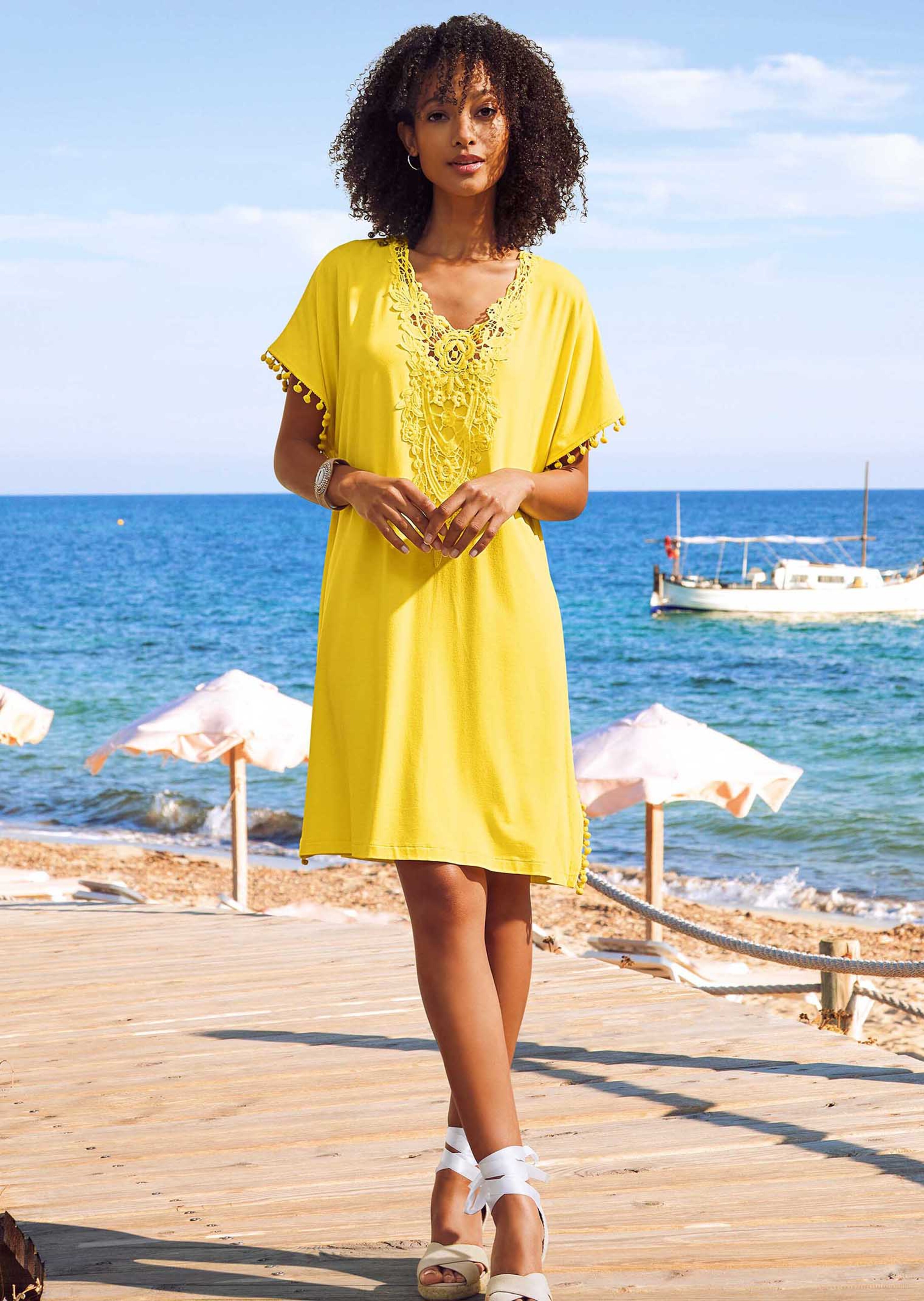 Jersey souple et fluide avec fibres durables de la marque LENZING™ ECOVERO™. Look maxi. Empiècement en dentelle sur l’encolure en V et bord fantaisie sur les côtés.