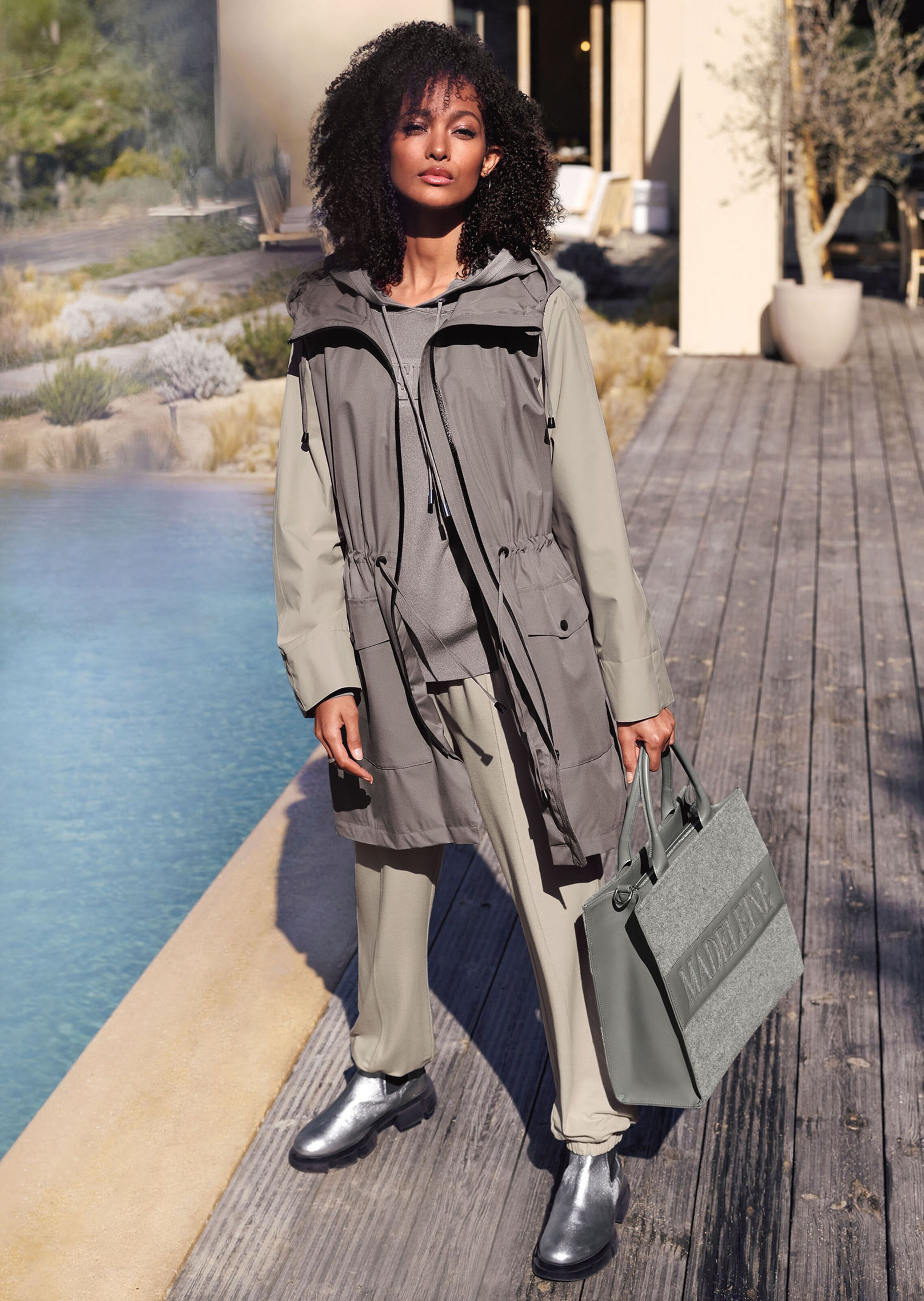 Modèle tendance style color block, déperlant et coupe-vent. Capuche, zip double curseur et grandes poches plaquées. Manches longues avec poignets coupe-vent. Taille et capuche réglables par passants tunnel et stoppers.
