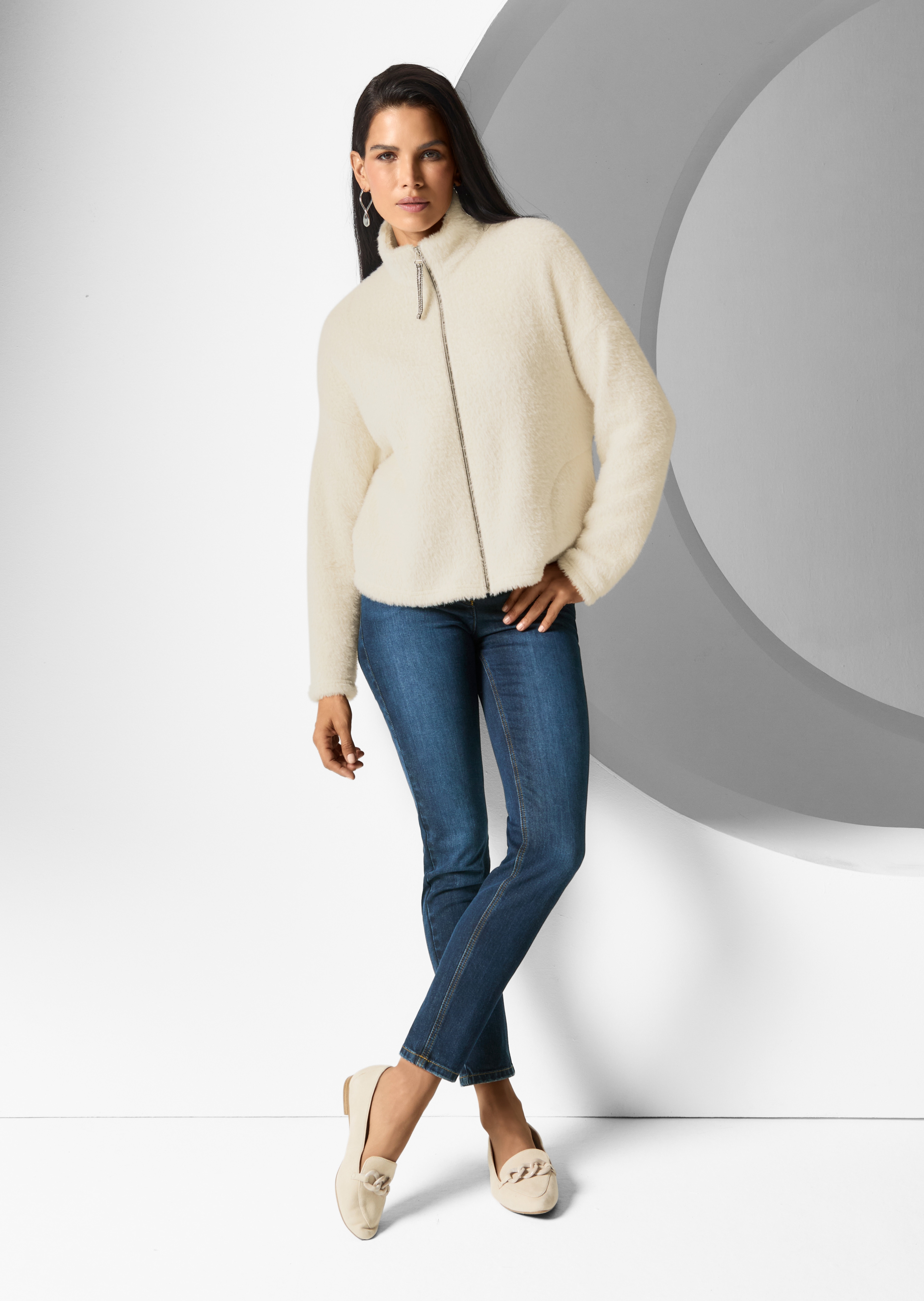 Fourrure synthétique douce et agréable. Coupe courte décontractée. Col montant, manches longues, zip et poches.