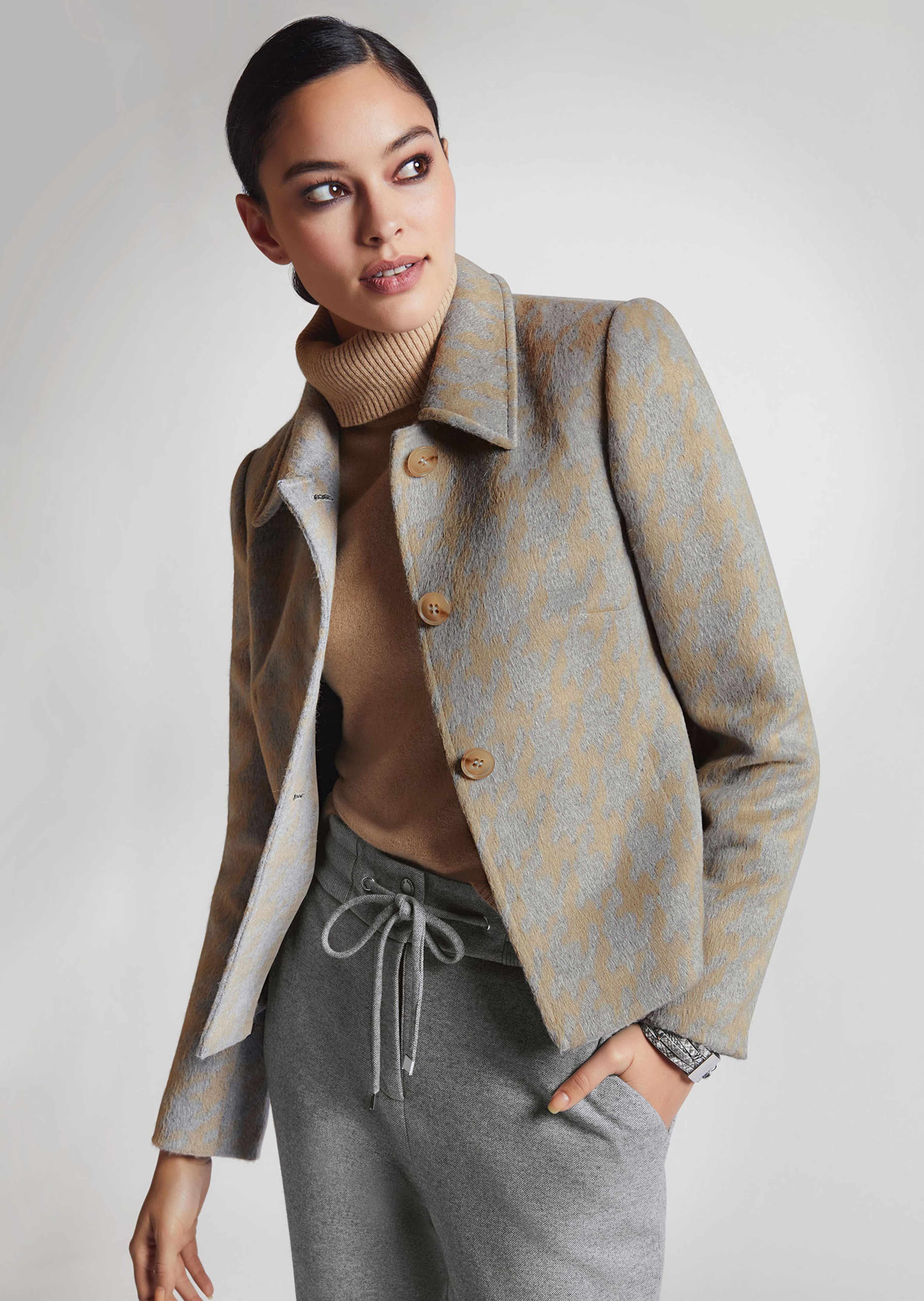Nouveau style chic en douce matière. Coupe légèrement cintrée. Col chemise, poches dans les coutures, boutons ton sur ton, coutures intérieures passepoilées et manches doublées.