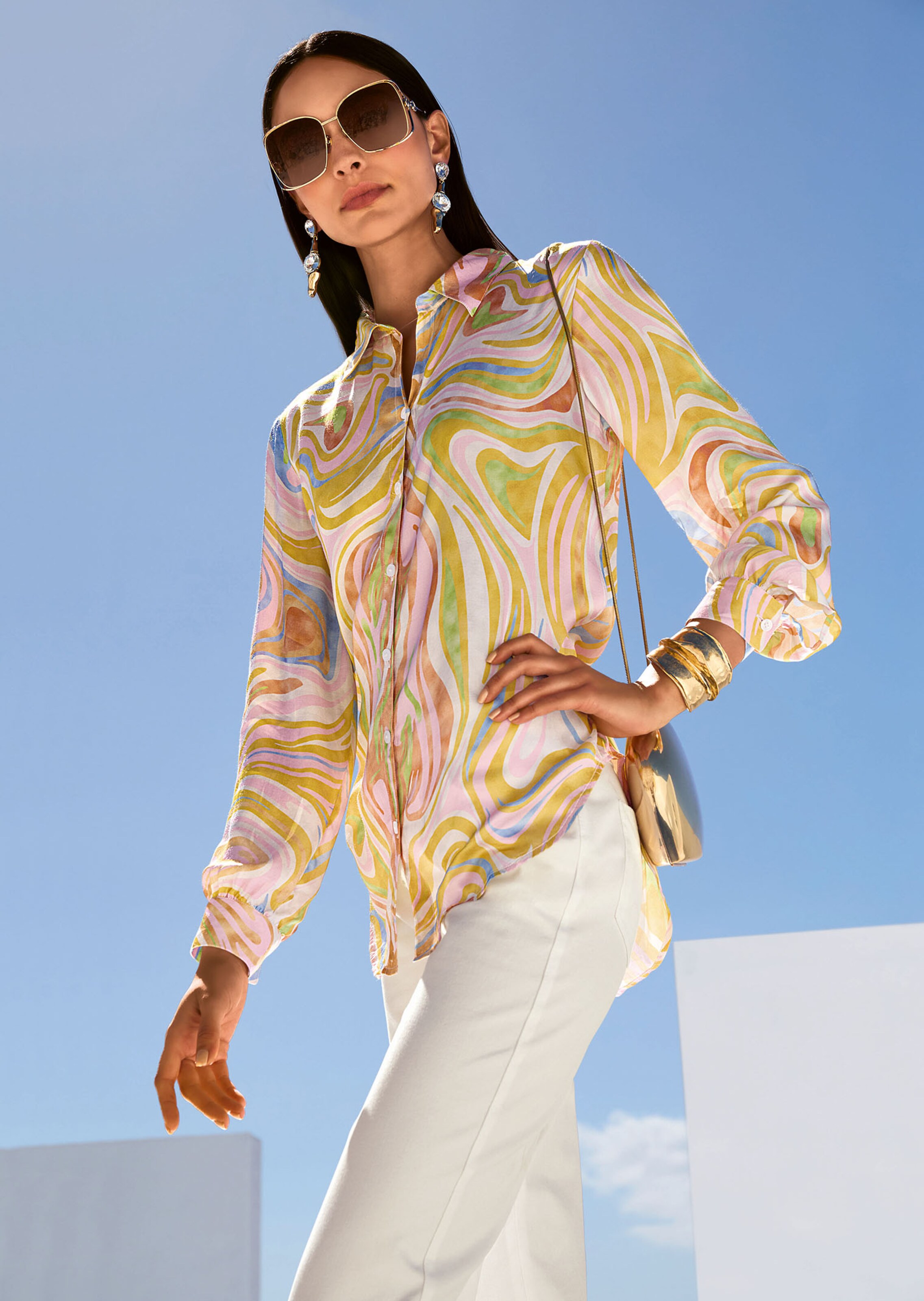 Coupe longue décontractée. Imprimé aux couleurs vives : chaque modèle est unique. Col chemisier, bande de boutonnage et base arrondie. Manches longues fendues avec poignets boutonnés.