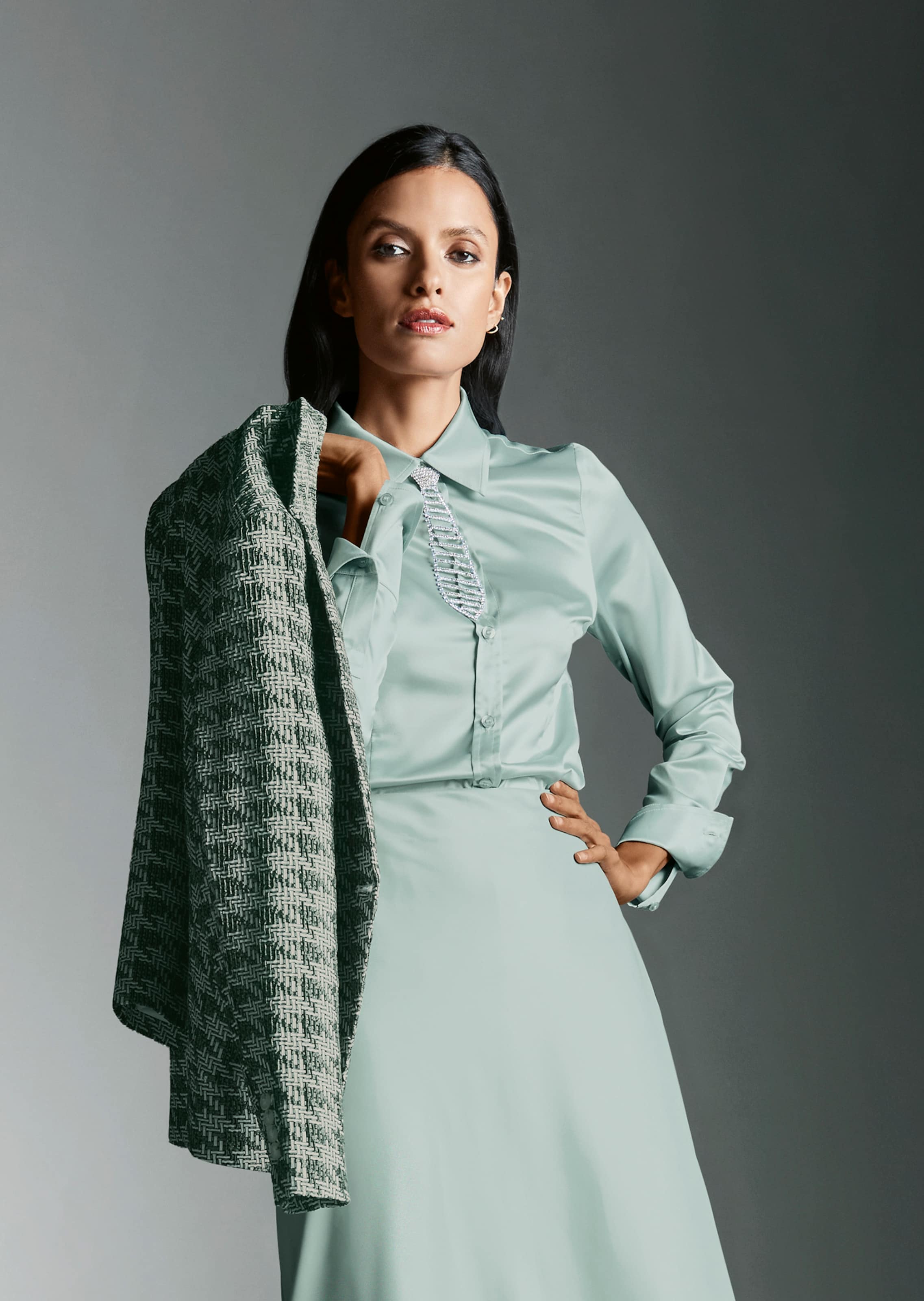 Matière stretch au confort parfait. Coupe cintrée avec col classique, bande de boutonnage, manches longues avec poignets boutonnés et base arrondie avec fentes latérales. Avec pinces, pour une ligne féminine.