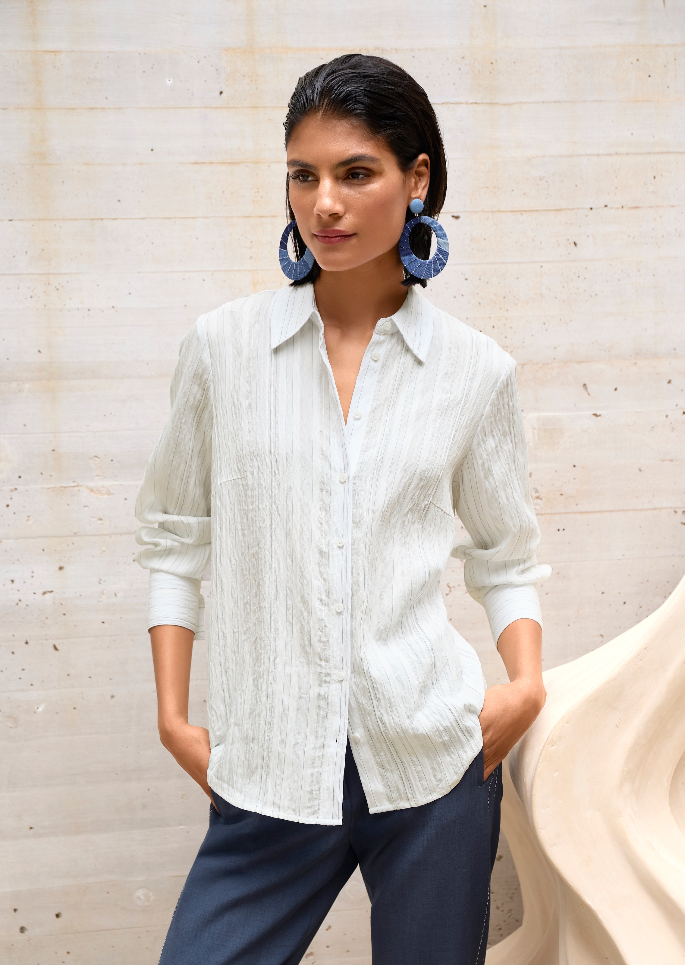 Fines rayures, en viscose mélangée très agréable. Coupe chemisier avec empiècement au dos, bande de boutonnage et base arrondie. Manches longues à poignets avec fente et bouton.