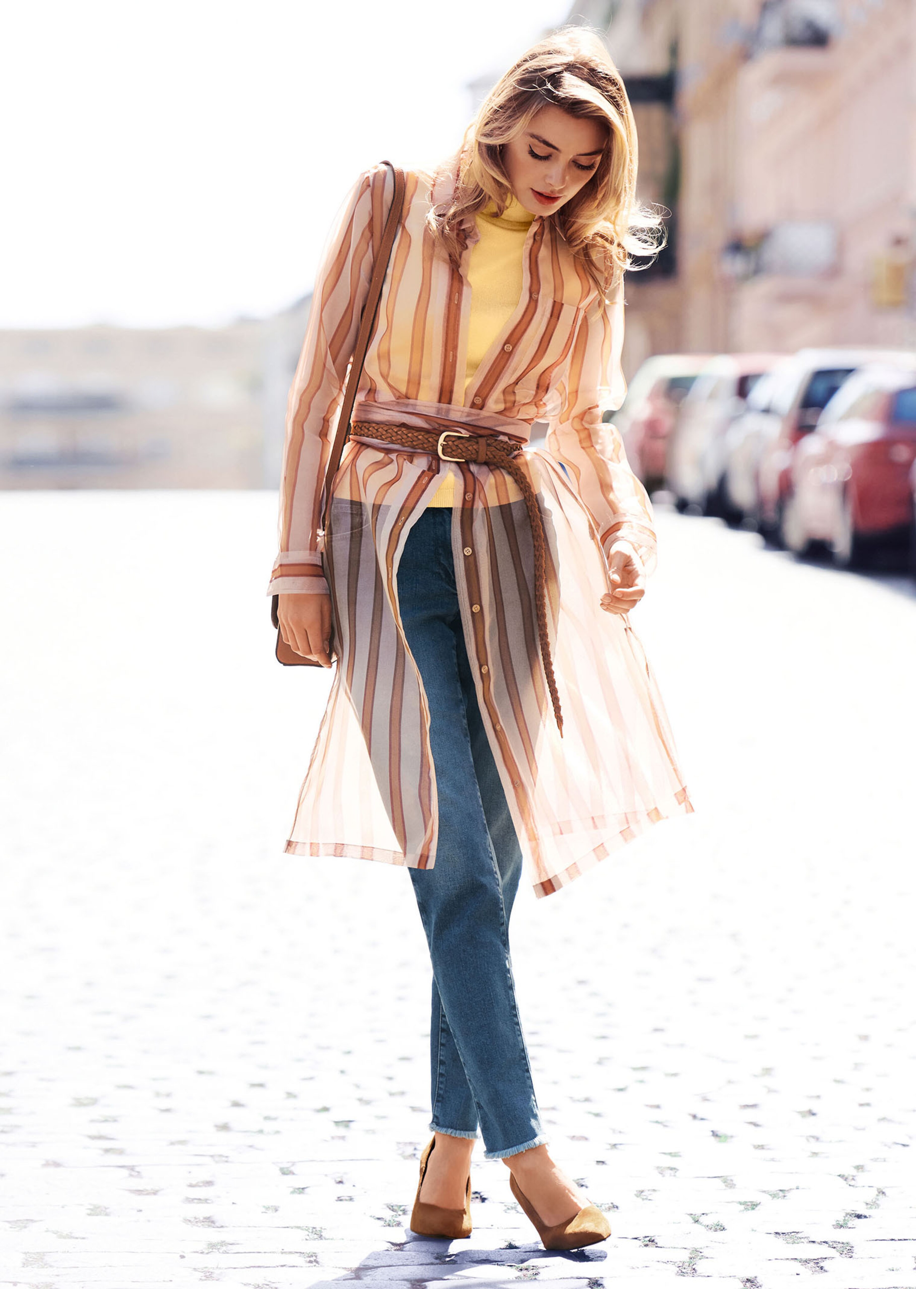 Un essentiel en organza très léger et transparent. Un talent stylé chic! Col chemise, bande de boutonnage et poche poitrine. Passants, large ceinture à nouer, manches longues à poignet boutonné et longues fentes latérales.