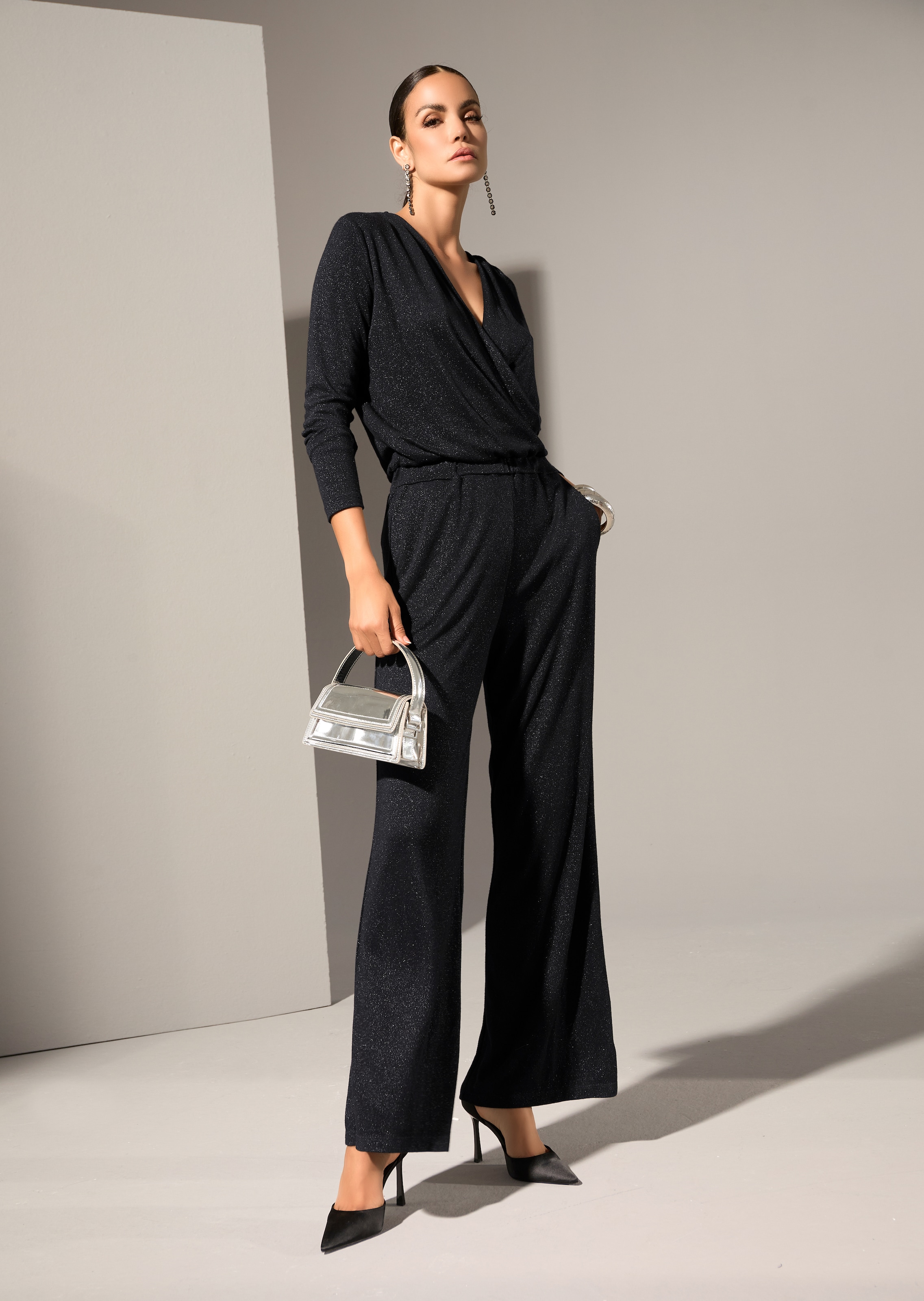 Chic et fluide, en matière légèrement brillante. Haut style cache-cœur avec manches longues ajustées. Pantalon large avec poches côtés et fausses poches au dos. Large taille élastiquée.