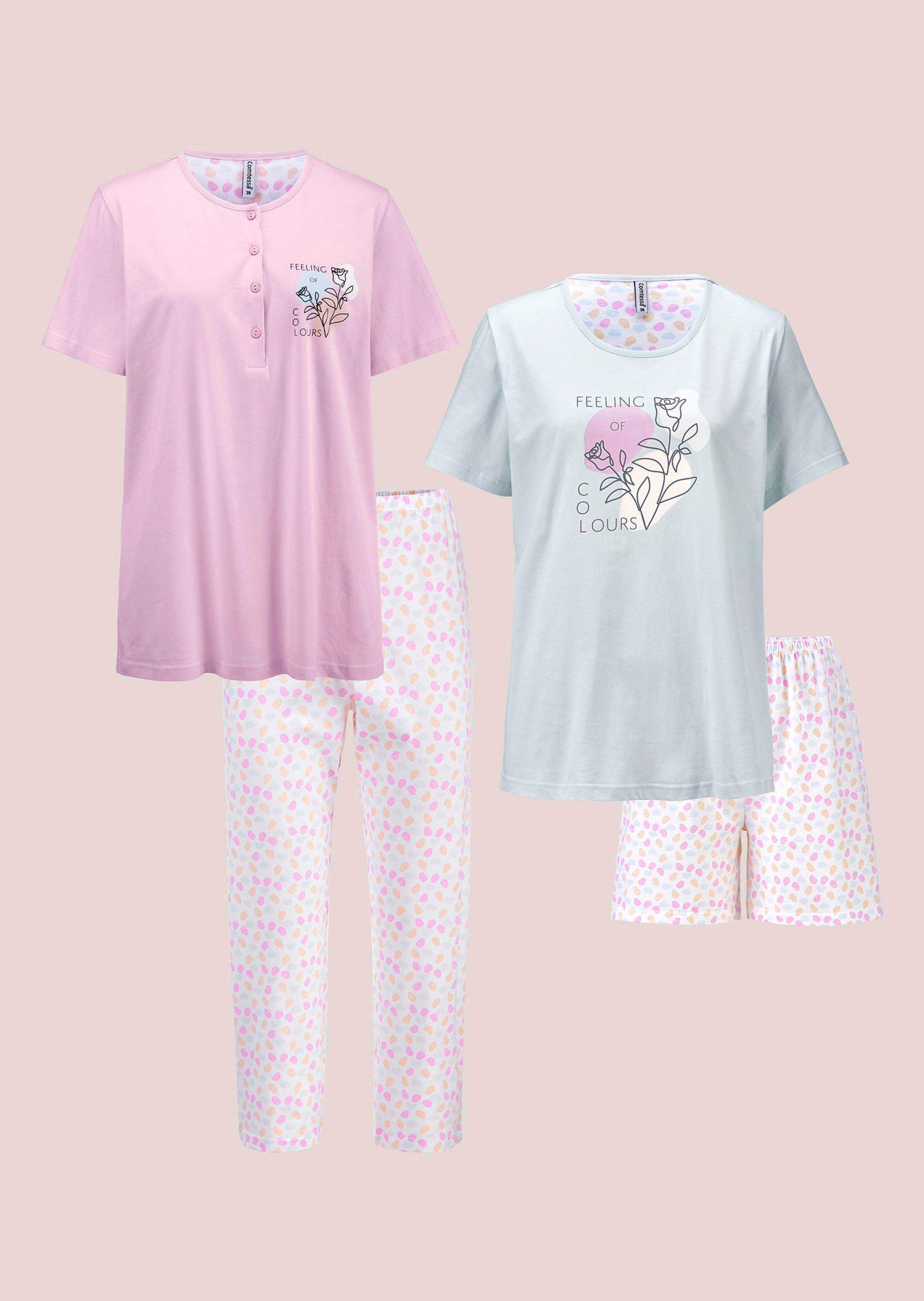 Ensemble pyjashort et pyjama COMTESSA. Les deux modèles sont en single jersey pur coton doux et agréable sur la peau. Pyjashort composé d'un T-shirt uni à manches coudes avec empiècement intérieur à motif pois et charmant motif imprimé, et d'un bermuda à motif pois avec taille entièrement élastiquée. Pyjama composé d'un T-shirt léger avec bande de boutonnage et d'un pantalon à motif pois avec petites fentes latérales.