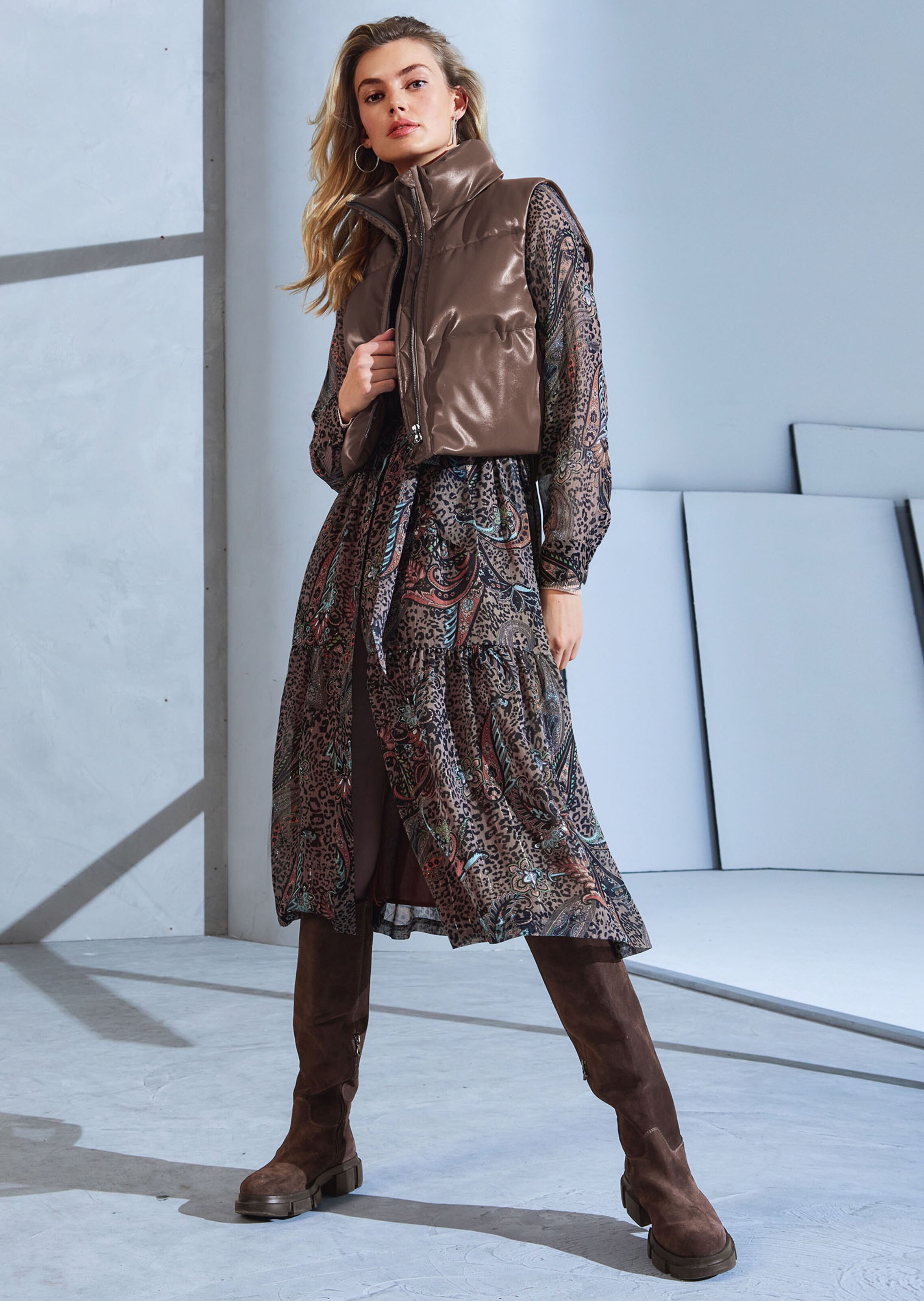 Indispensable pièce matelassée en matière synthétique souple. Coupe courte. Col montant et zip double curseur.