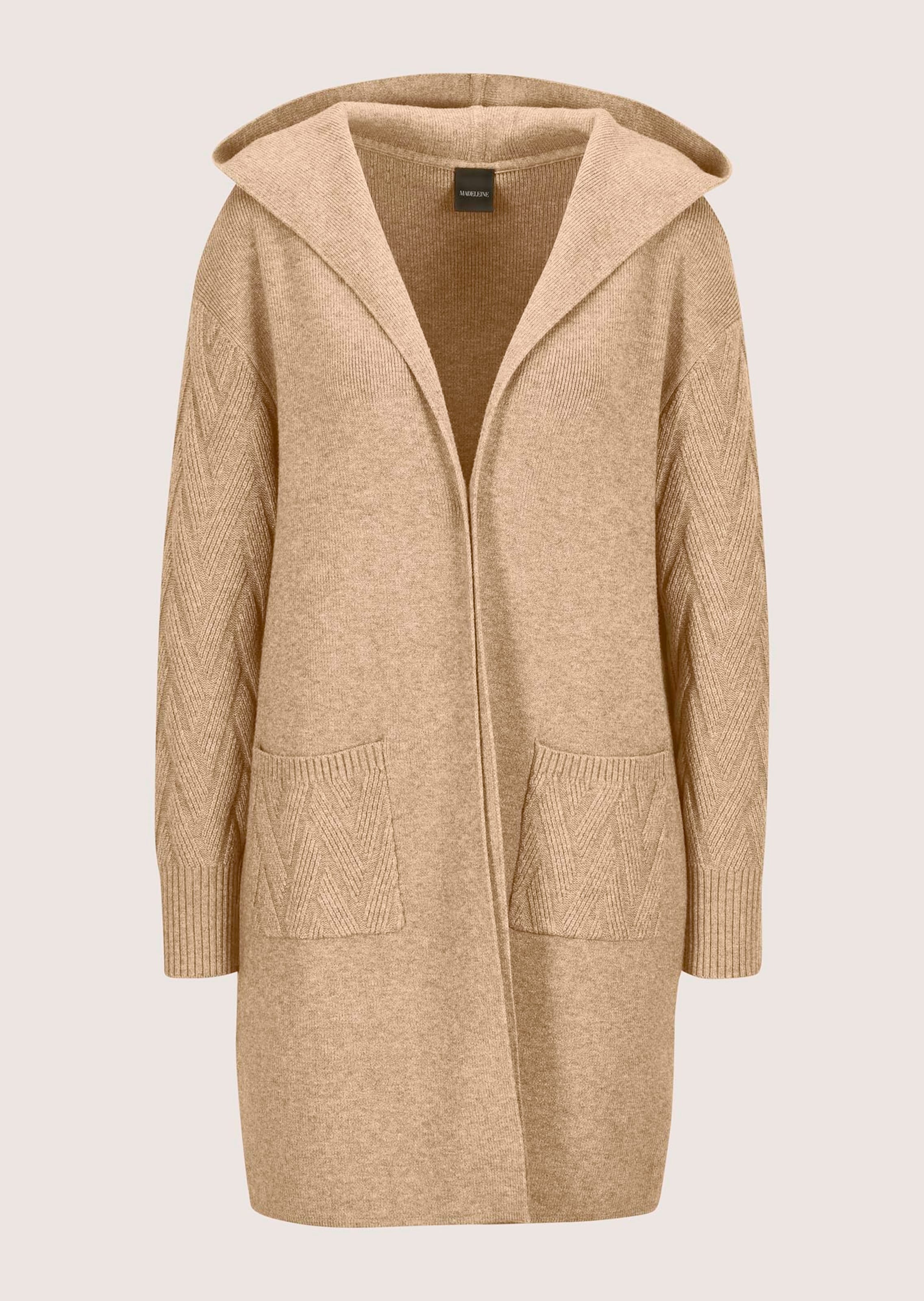 Élégante maille jersey endroit. Coupe longue ouverte et décontractée, capuche, manches longues et poches plaquées. Motif jacquard haut de gamme sur les manches et sur les poches. Longs bords-côtes d'une tenue irréprochable au bas des manches.