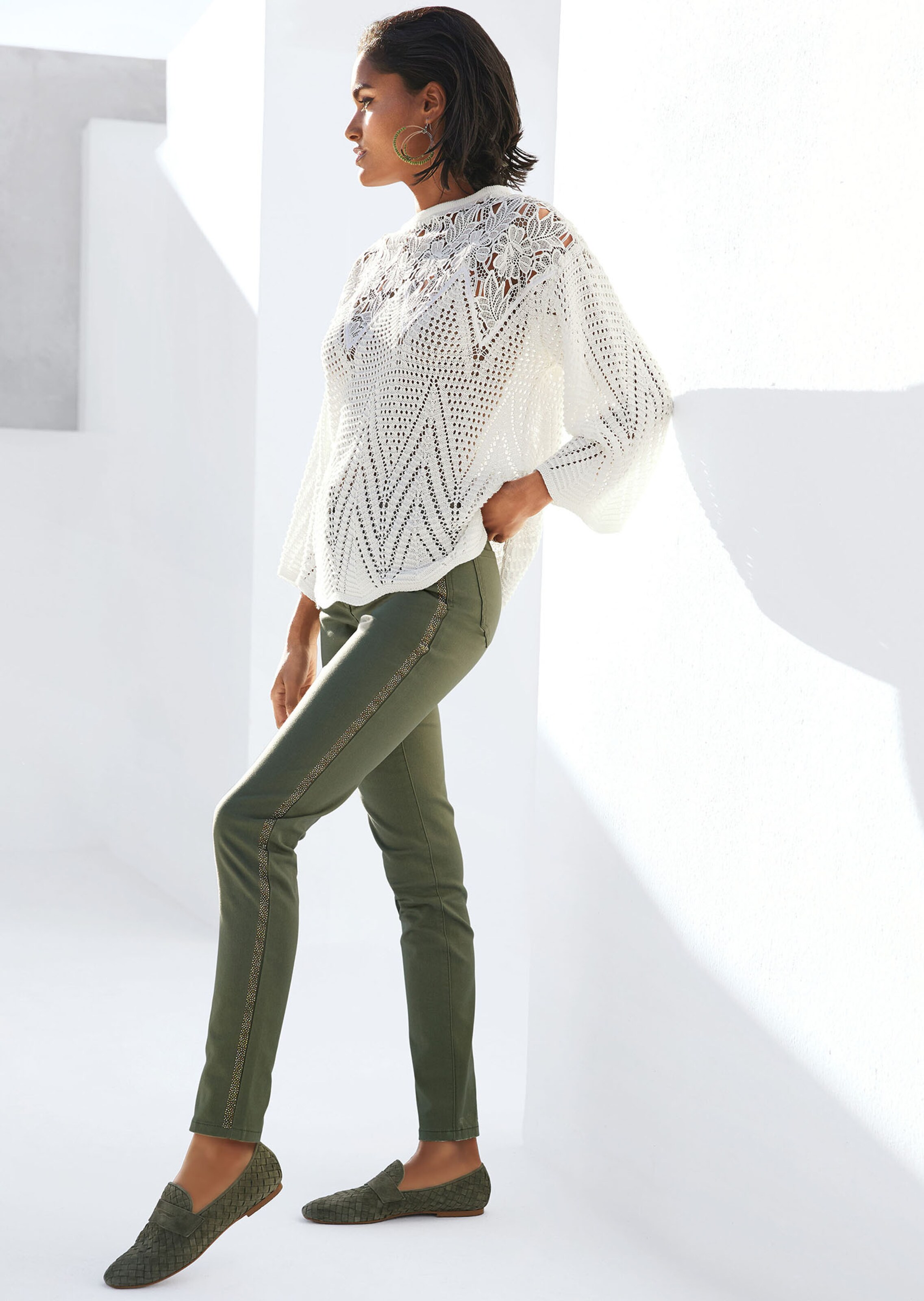 Ligne slim tendance style 5 poches. Poches plaquées au dos et coutures côtés soulignées de strass. Passants à la taille.