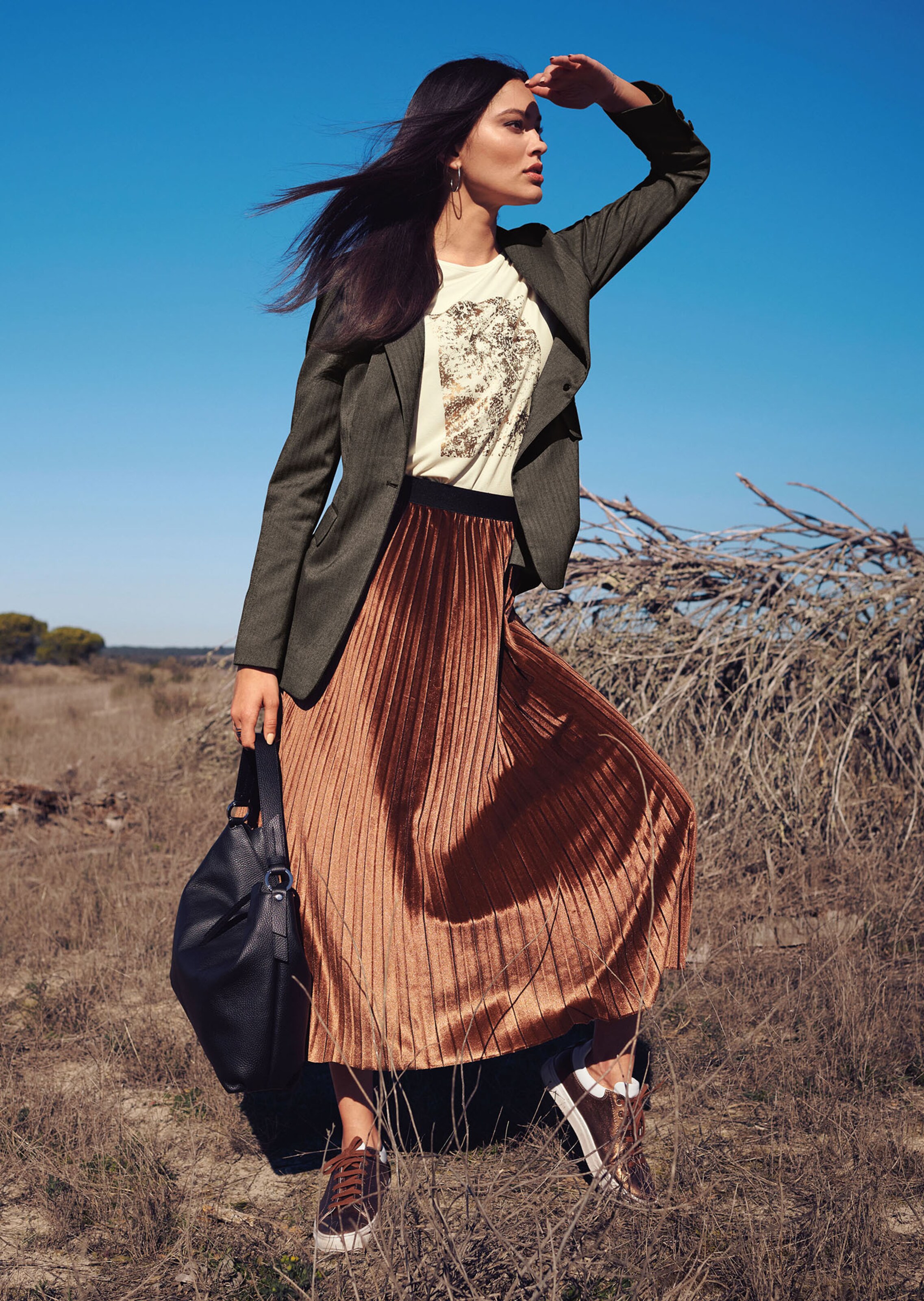 Velours satiné finement plissé, rehaussé de rayures noires. Coupe évasée à l'effet dansant, longueur midi tendance. Taille élastiquée contrastante.