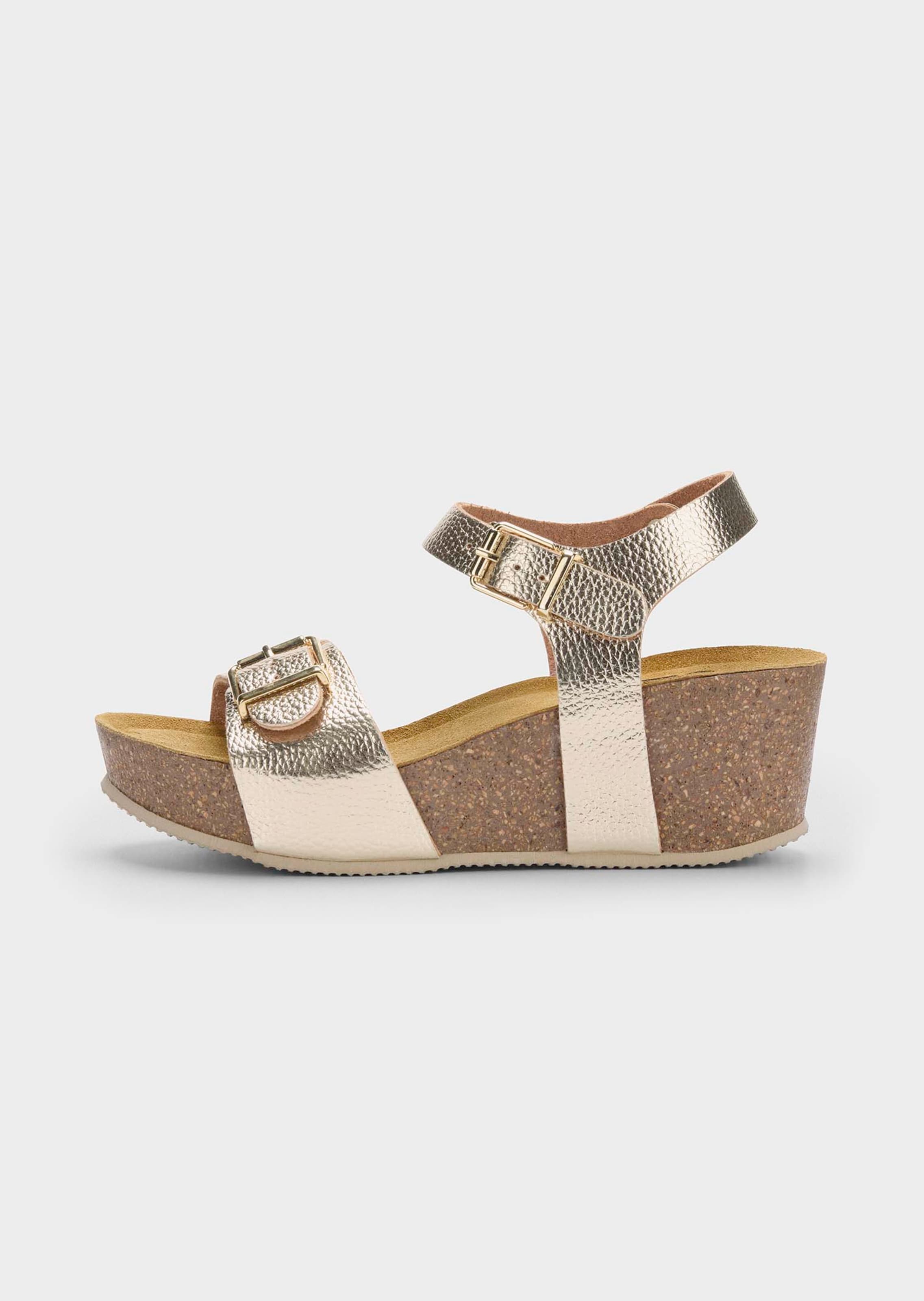 Aspect métallisé et talon compensé. Boucles à ardillon réglables.