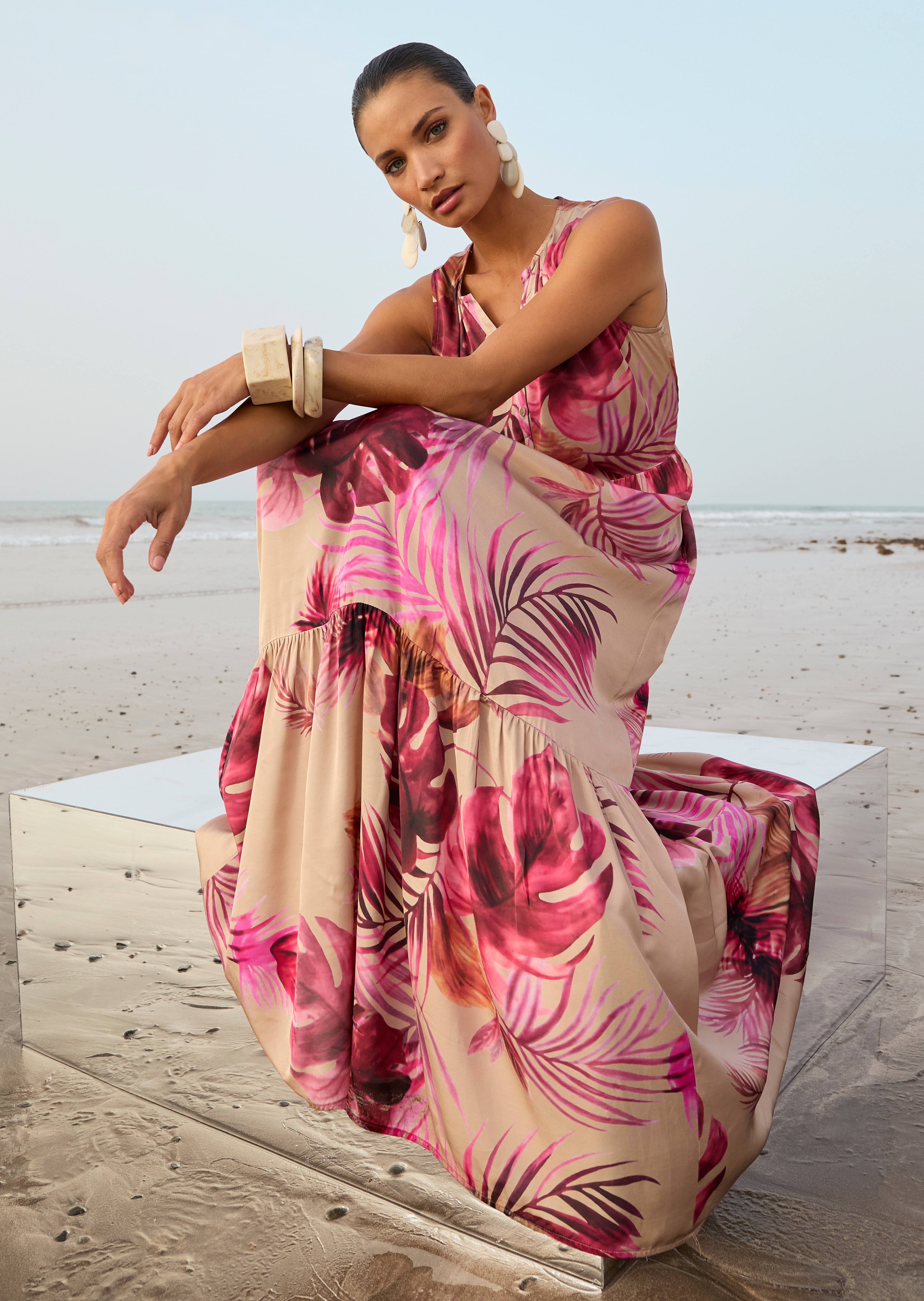 Sublime modèle sans manches avec poches côtés dans les coutures et radieux imprimé feuille haut en couleur. Encolure arrondie, empiècement en V et petite bande de boutonnage. Taille soulignée par une couture et jupe à étages volantés pour un effet dansant.