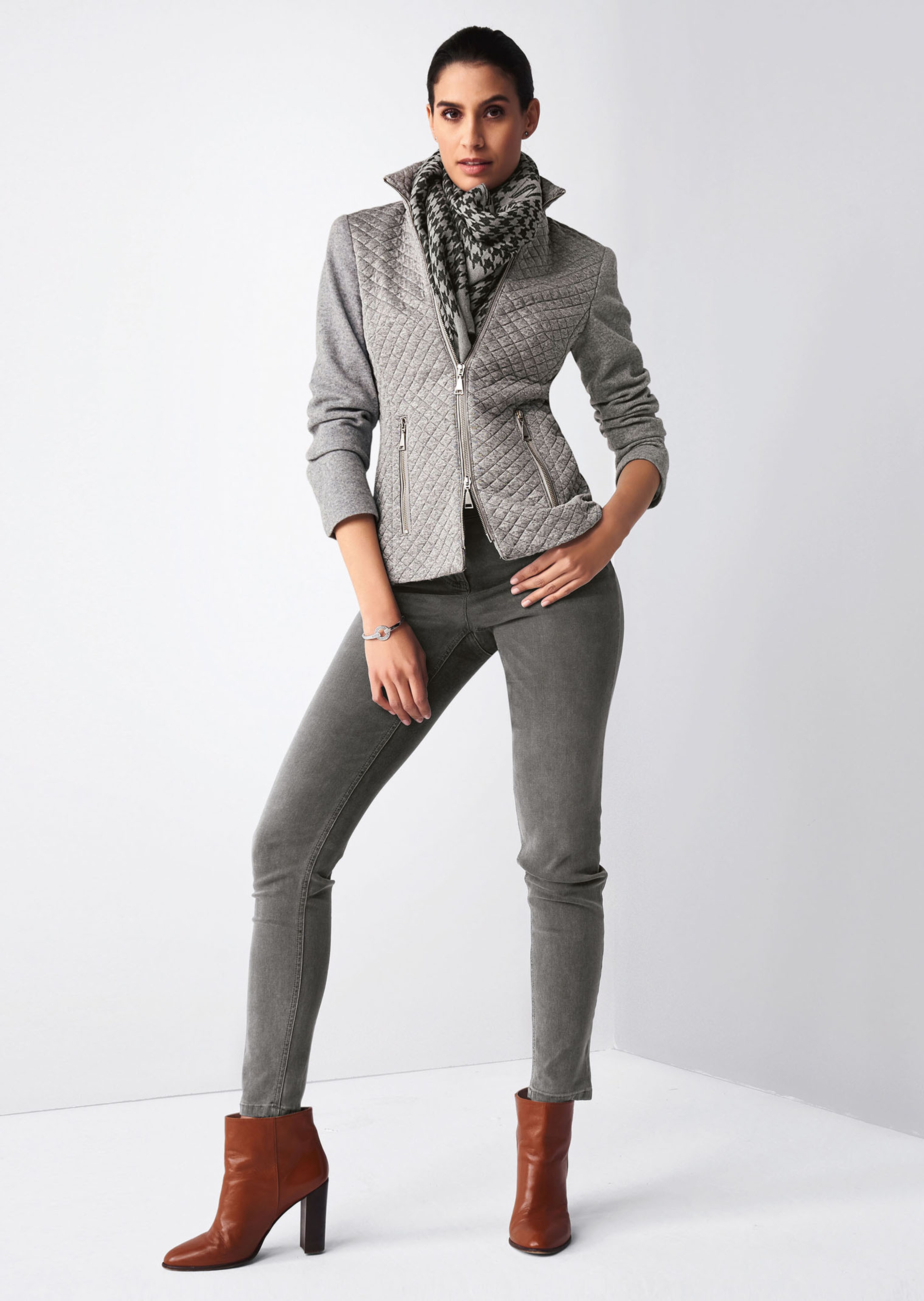 En mélange de jersey confortable et indéformable. Forme élancée, légèrement cintrée. Devant et col montant avec surpiqûres losanges. Manches longues et dos en qualité lisse à haute teneur en laine. Avec une fermeture éclair à double sens et des poches à fermeture éclair. Doublure élastique en tricot.