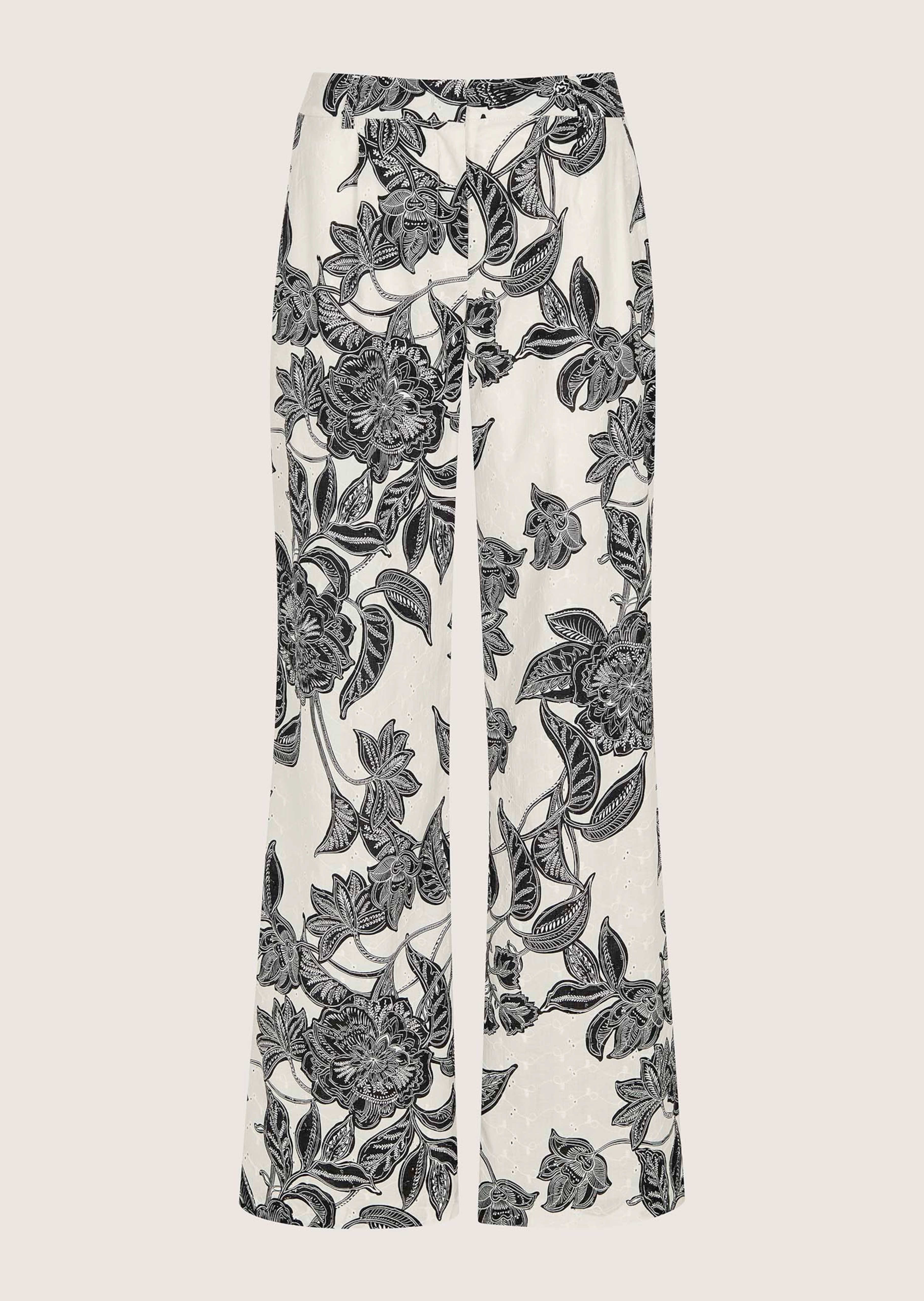 Coton avec élégant imprimé fleuri et luxueuse broderie de Madère. Très agréable grâce à la doublure. Passants de ceinture, fermeture agrafée et bouton intérieur. Poches côtés pratiques, jambes larges, pinces et plis marqués.