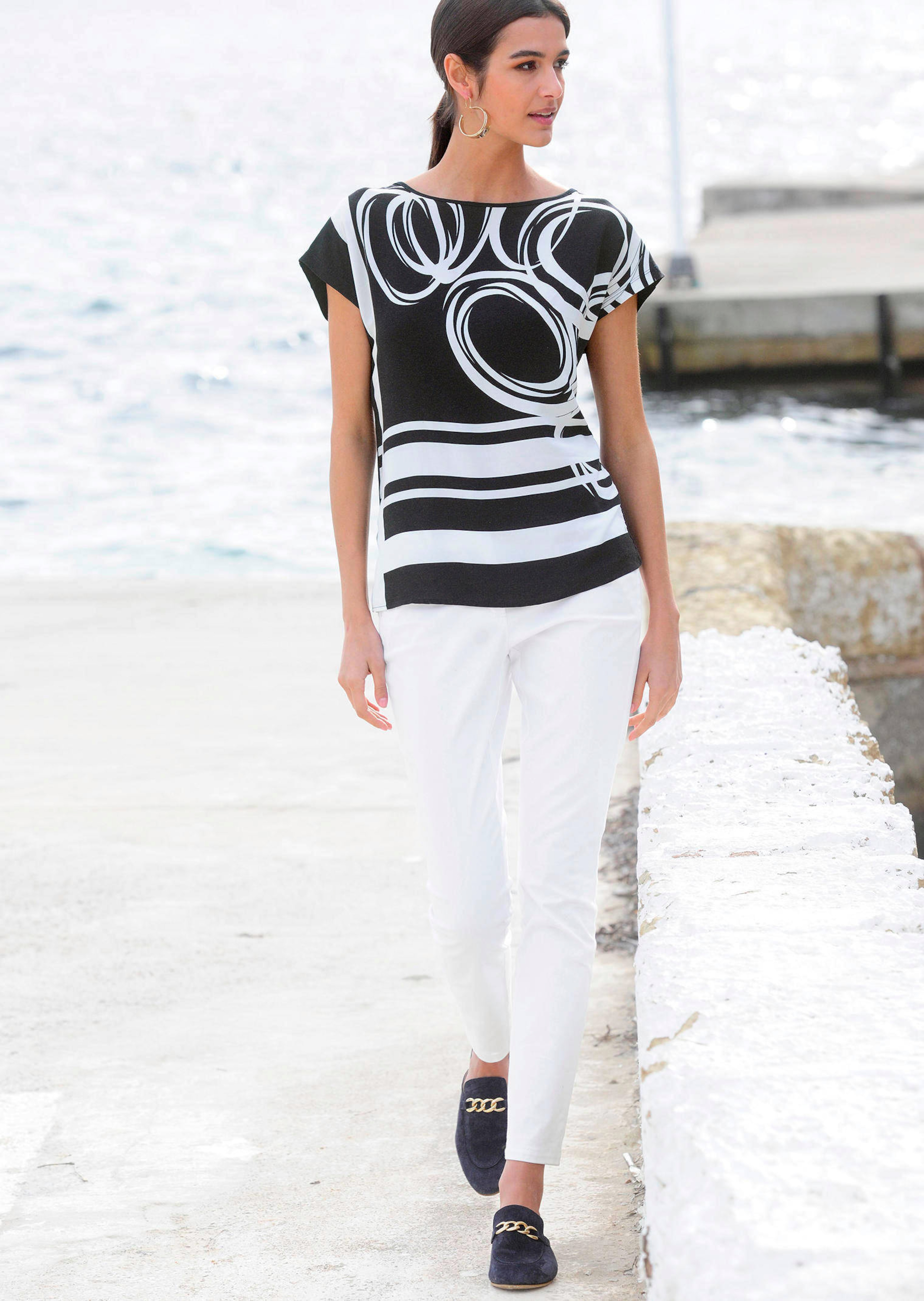 Découvrez une mode qui fait plaisir - par exemple ce t-shirt imprimé d'Alba Moda Le motif graphique est un détail particulièrement beau. Il a une encolure U-Boot. Il a une coupe droite. Manches courtes avec une finition droite. Le matériau utilisé est facile d'entretien et la viscose. Commandez ce t-shirt imprimé d'Alba Modaganz en toute décontraction en ligne, et il vous sera livré à domicile en un rien de temps.