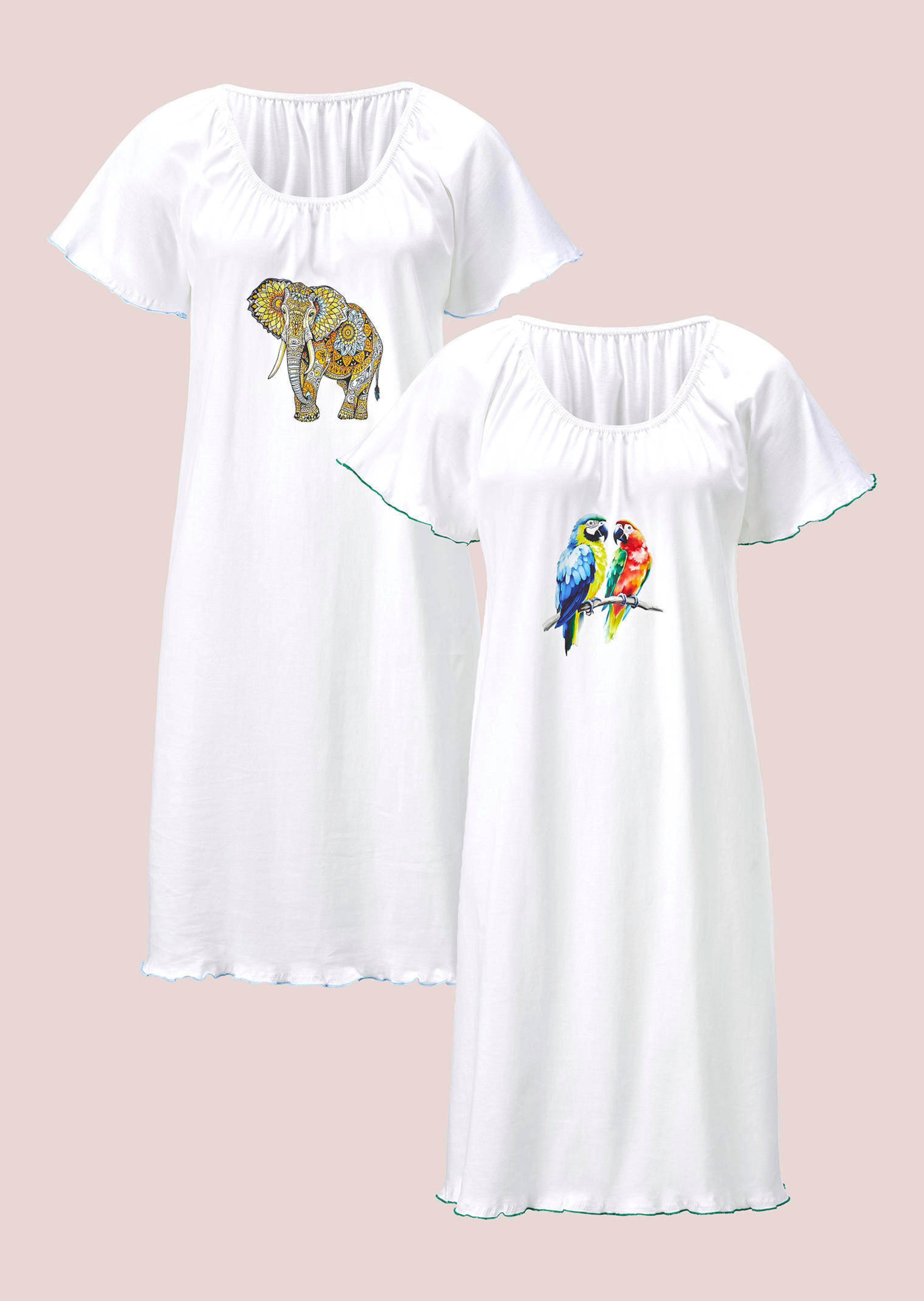 Lot de 2 chemises de nuit en pur coton doux et léger sur la peau. Pratiques et agréables, avec coupe décontractée et encolure arrondie légèrement froncée qui facilite l'habillage. Bords ondulés contrastants au bas des manches raglan et à la base, pour une note de couleur. Un motif imprimé exotique sur chacun des modèles.