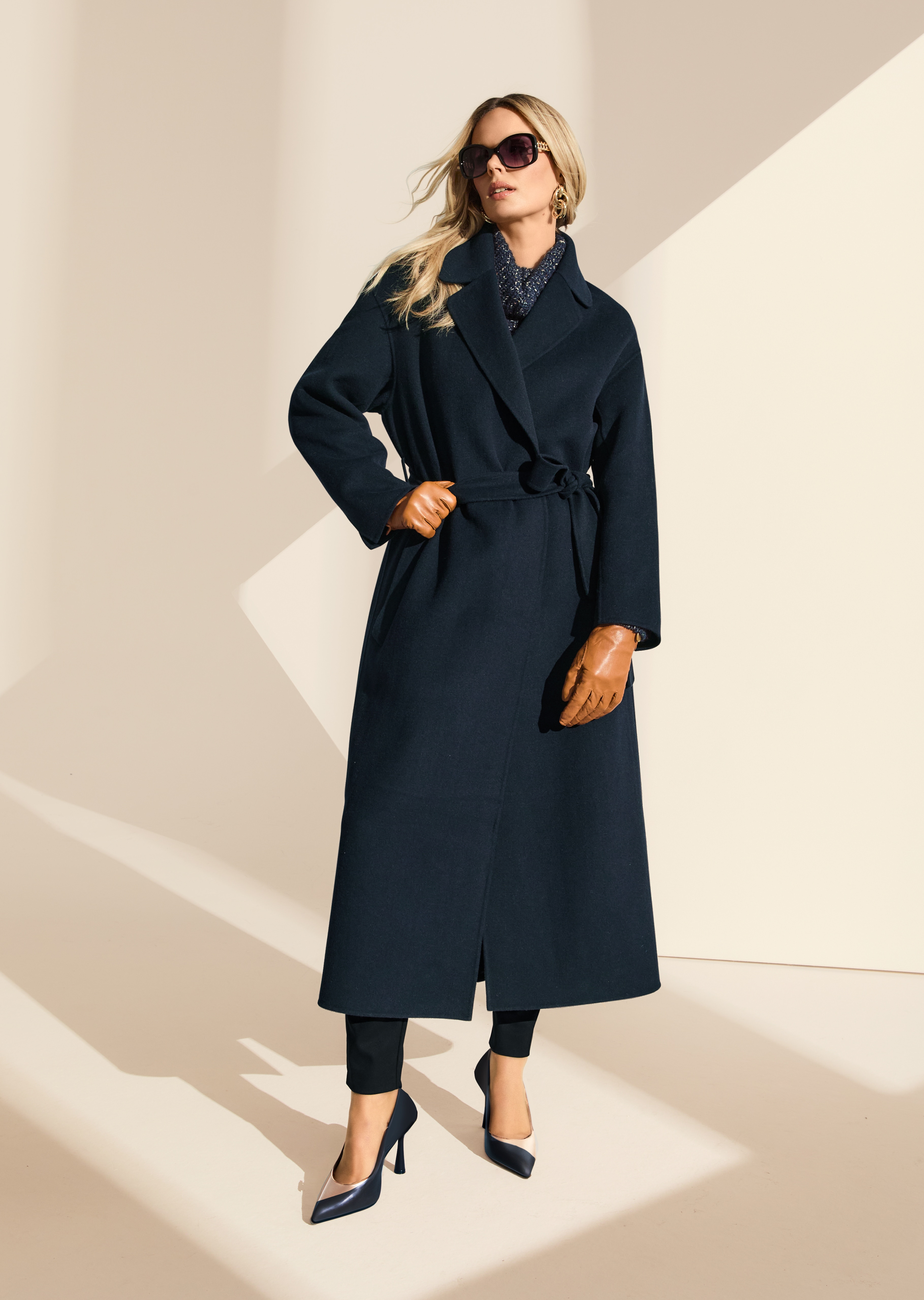 Luxueux manteau en laine double face. Style chic et décontracté. Fermé par ceinture à nouer. Col à revers arrondi, poches, épaules descendues et manches longues. Coutures fantaisie.