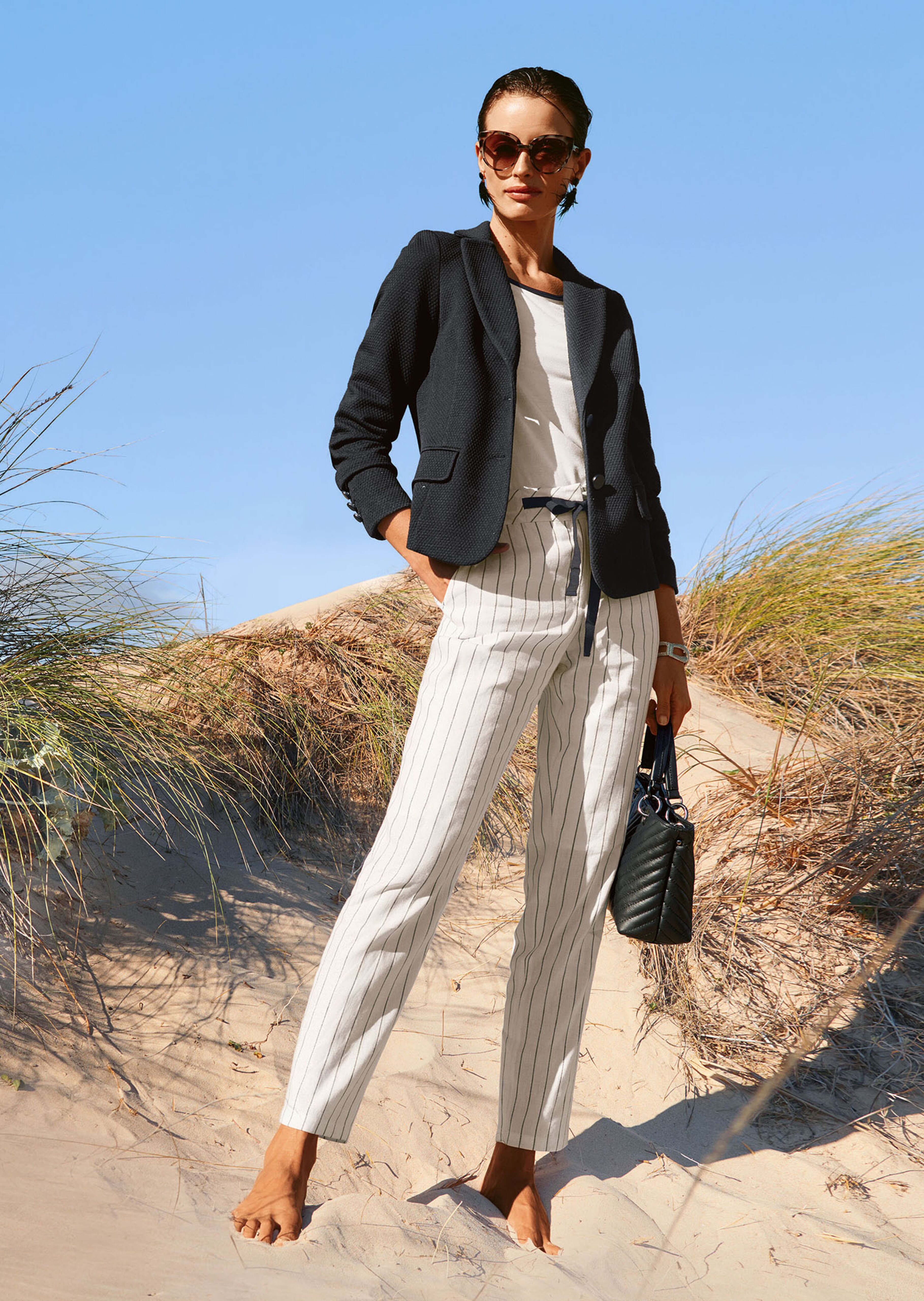 Fines rayures, pour les tenues chics. Ligne décontractée longueur cheville. Passant tunnel, fermeture par agrafes et poches côtés.