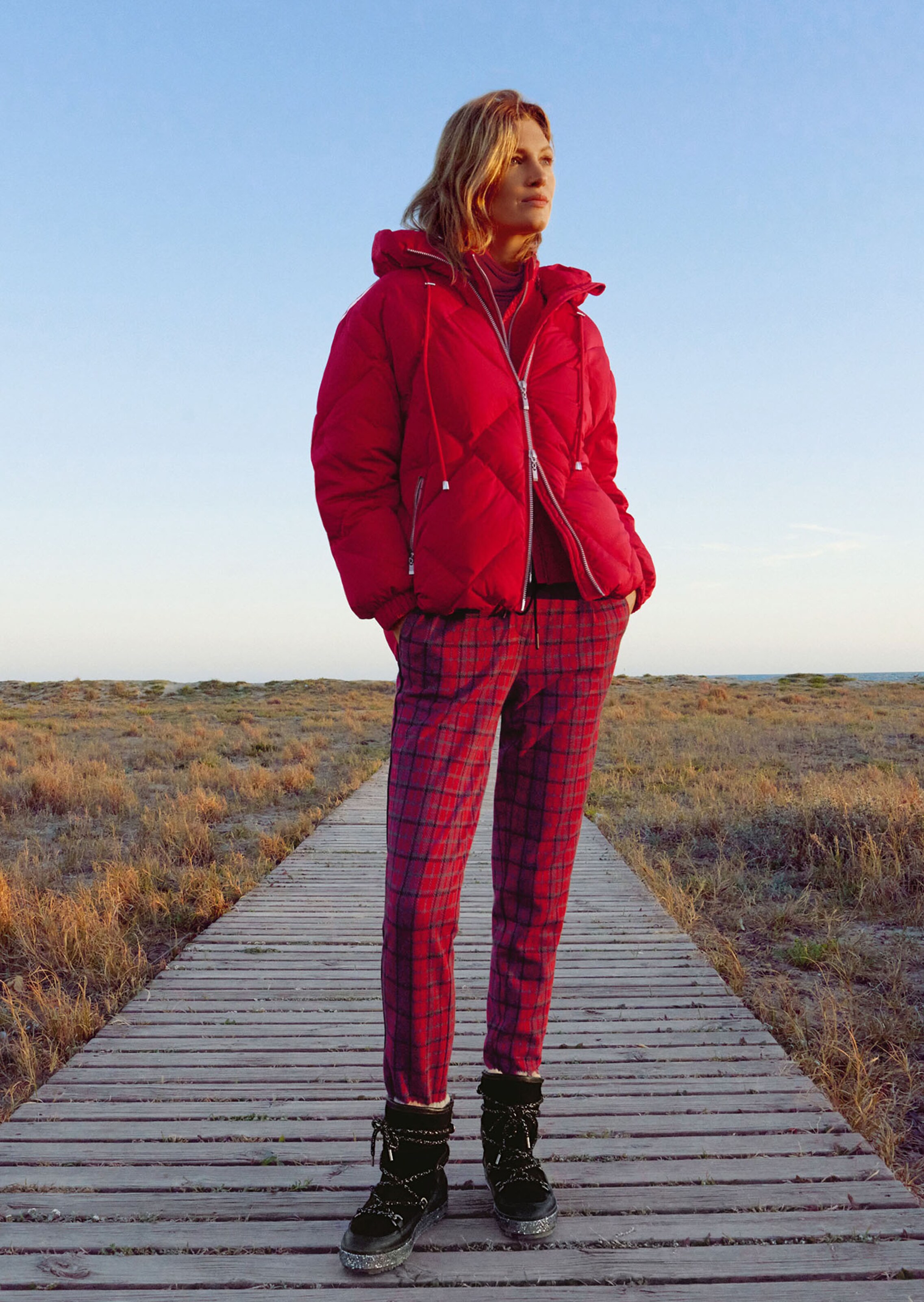 Motif carreaux tendance. Jogpant luxueux et confortable à la ligne élancée. Pinces à la taille, poches côtés, fausses poches au dos et fausse poche côté passepoilée. Taille avec fermeture agrafée et lien coulissant devant et empiècement extensible au dos.