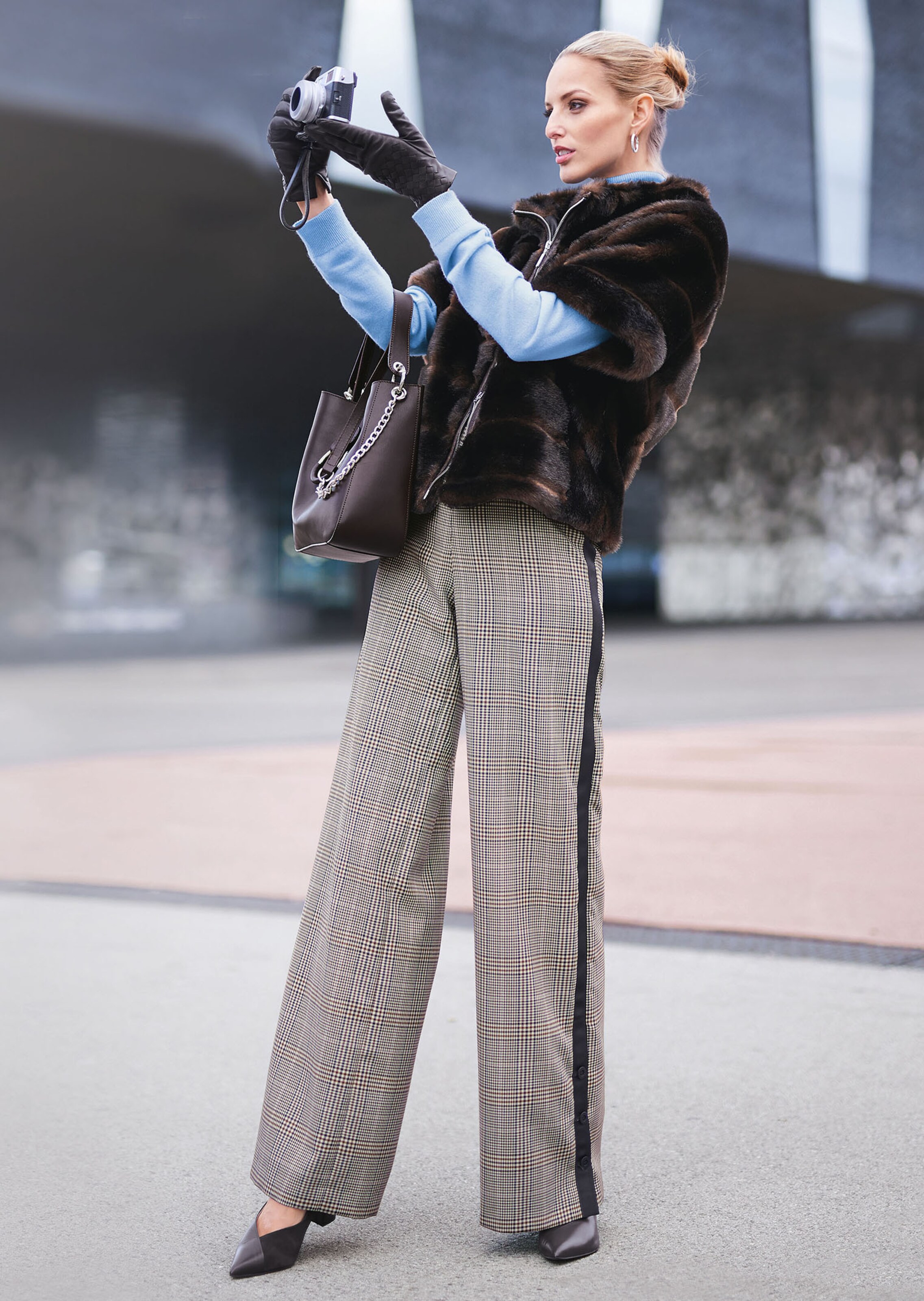 Coupe large à motif prince-de-galles en Ceramica. Ruban de reps sur les côtés à ouvrir sur 3 boutons au bas des jambes. Sans poches. Une fausse poche au dos soulignée d'un ruban de reps.