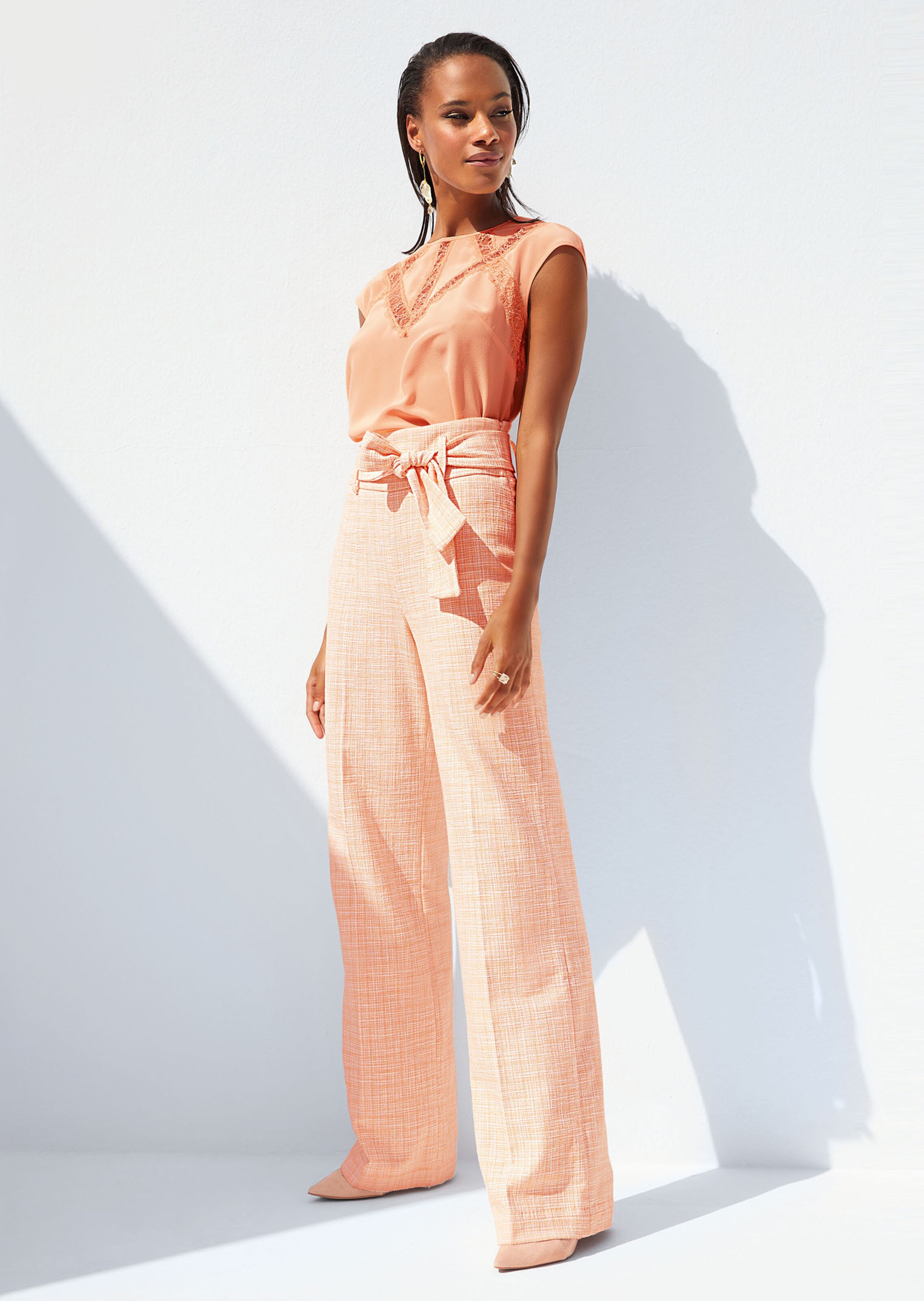 Tweed bicolore chic. Taille haute tendance. Jambe à l'ampleur mode et plis marqués. Large taille avec passants, ceinture à nouer amovible et zip côté.