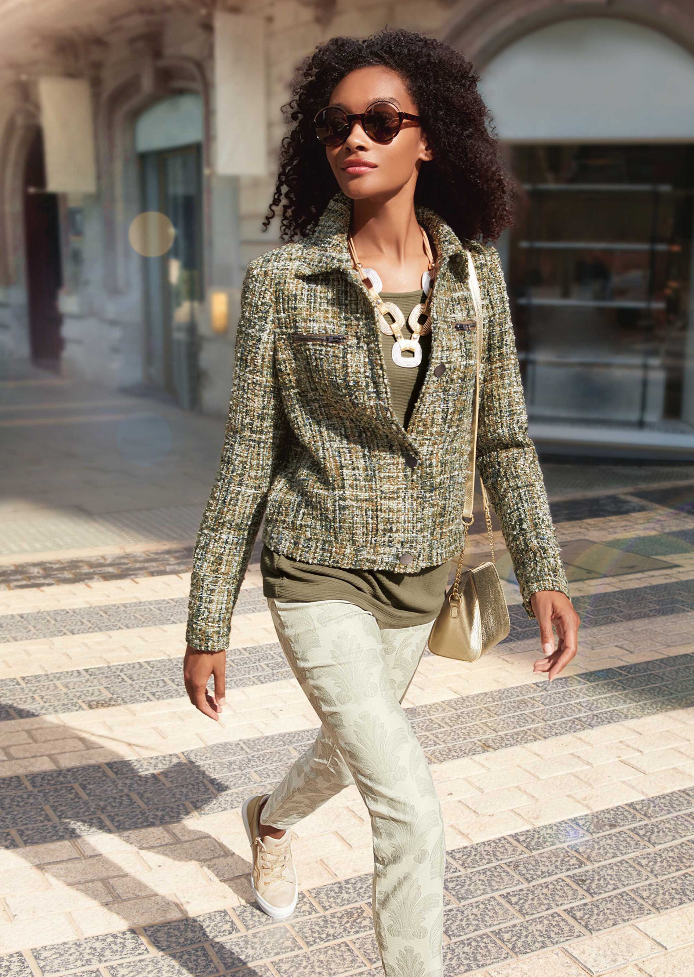 Sobre imprimé ornemental d'une grande élégance. Ligne élancée longueur cheville. 5 poches, passants et jambe étroite.