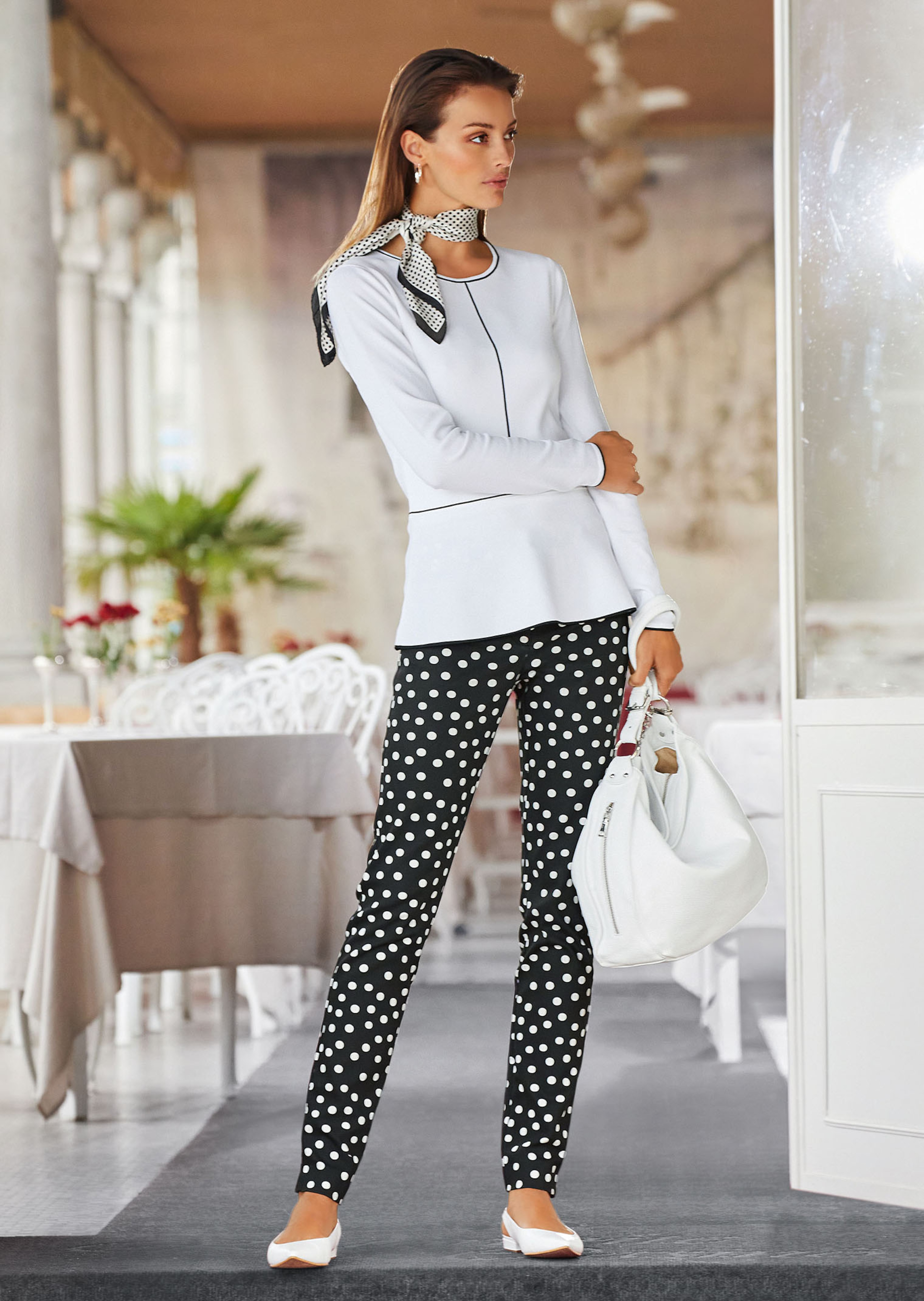 Motif à pois mode. Coupe près du corps. Poches devant et au dos. Passants et bouton à l’intérieur de la ceinture.