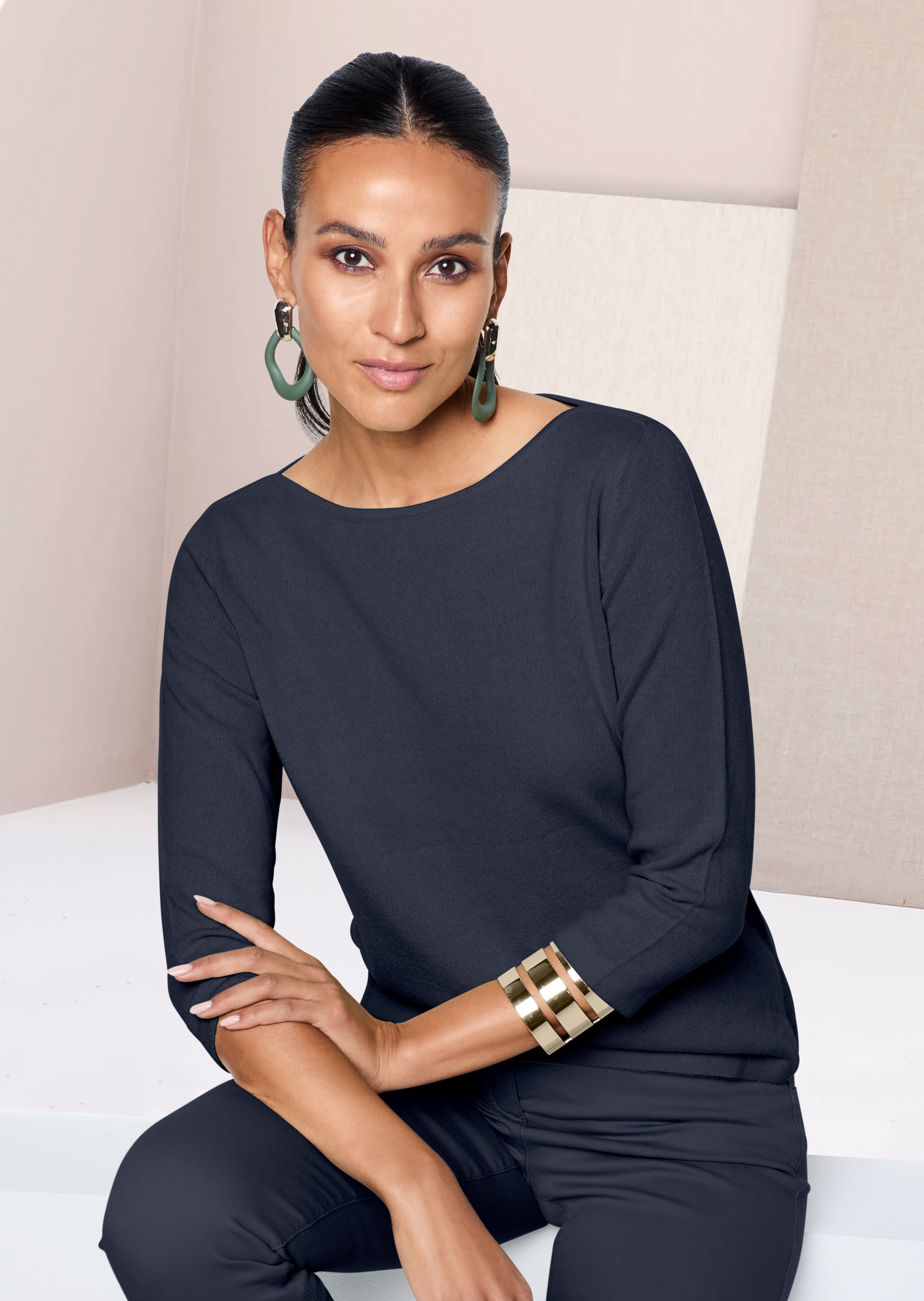 Pièce luxueuse à la coupe droite. Encolure bateau, manches 3/4 et finitions plates.