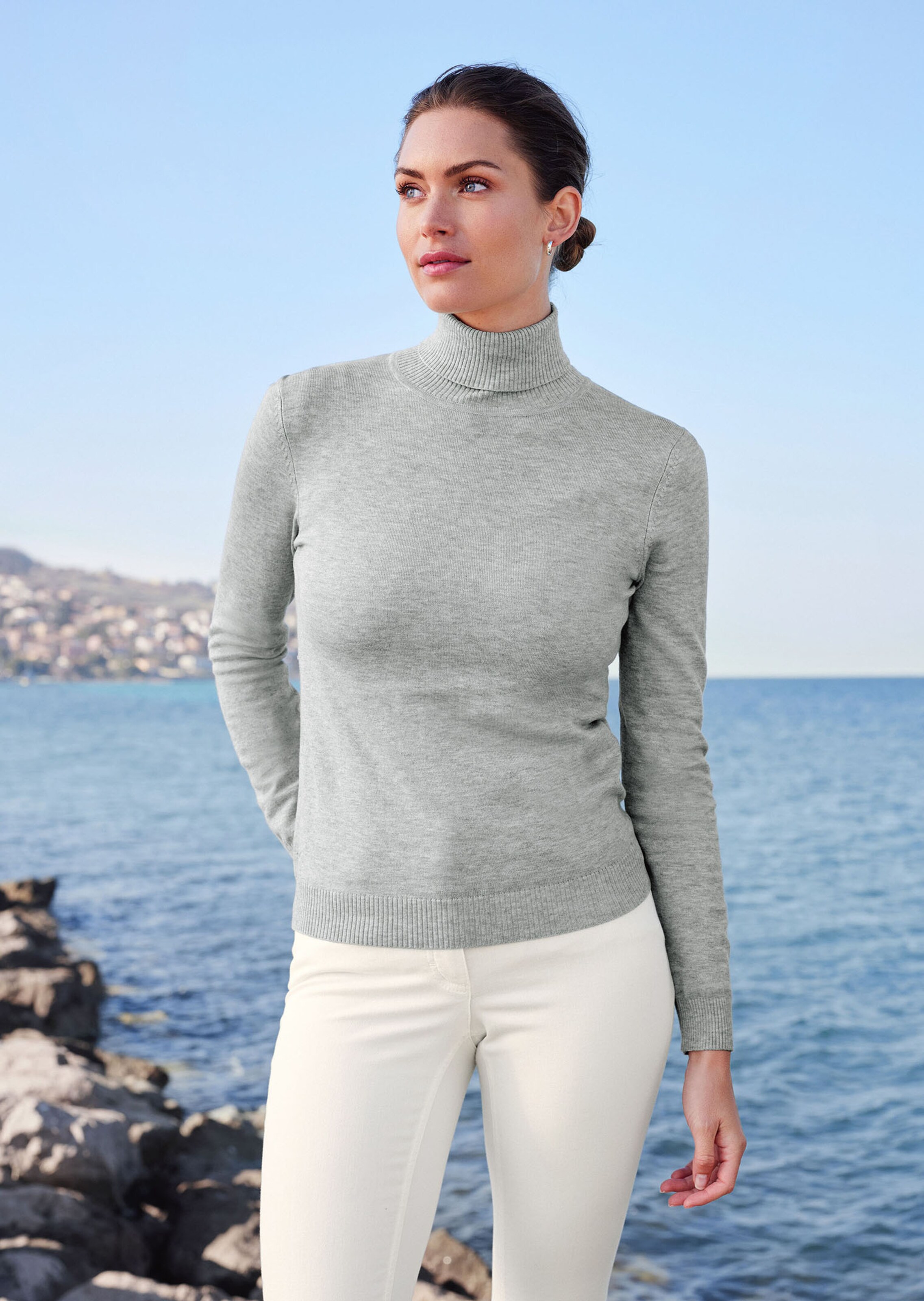 En fine maille, ligne près du corps. Col roulé, bords-côtes au bas des manches et à la base.