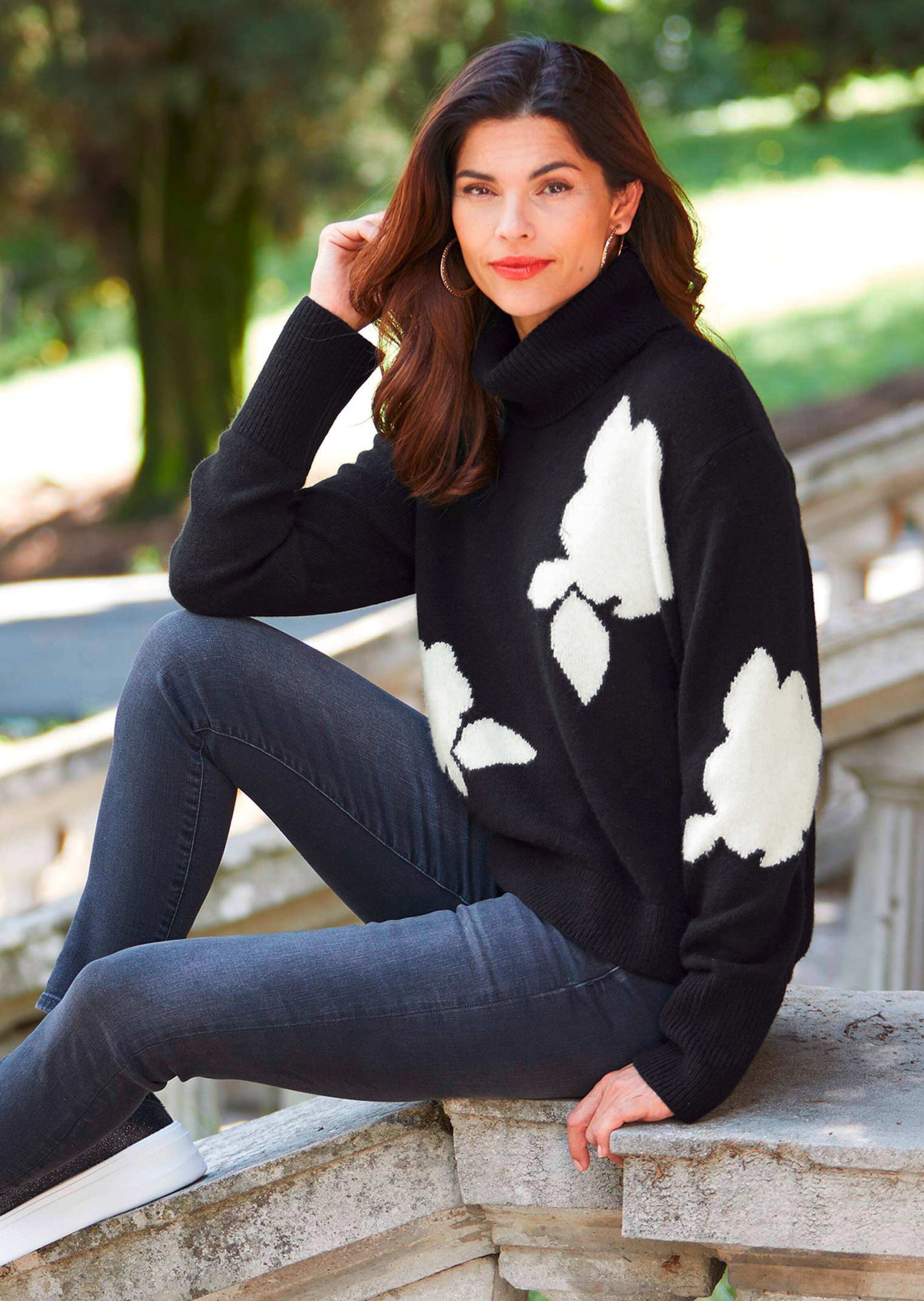 Der Strickpullover von JOOP aus einer hochwertigen Wolle-Kaschmir-Qualität schmiegt sich weich an und wärmt an kalten Tagen. In legerer Oversize-Passform mit Turtleneck und Fledermausärmeln sitzt er bequem und bringt zugleich eine moderne Note mit sich. Alle Säume schließen mit Bündchen ab. Besonders schön ist das florale Intarsienmuster – die vereinzelt platzierten Blüten verleihen dem Modell eine feminine Optik. Länge in Gr. 38 ca. 56 cm. Styling-Tipp: Die weite Form verlangt nach schmalen Unterteilen, die die Silhouette akzentuieren – tragen Sie eine schmale Jeans dazu. Mit hohen Stiefeletten wird ein sportlich-eleganter Look draus!