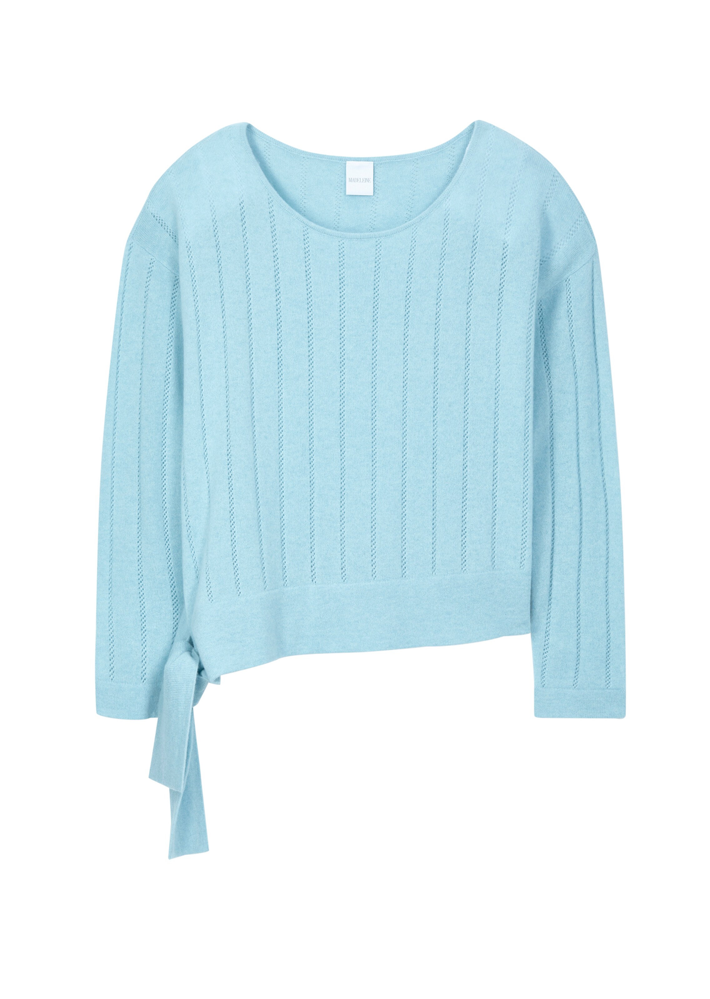 Fil haut de gamme très doux, travaillé avec de fines bandes ajourées qui laissent transparaître la peau. Ligne décontractée. Encolure arrondie, manches longues et base asymétrique à nouer sur le côté. Pour cet article, nous utilisons une laine de cachemire de première qualité, certifiée selon The Good Cashmere Standard® by AbTF.