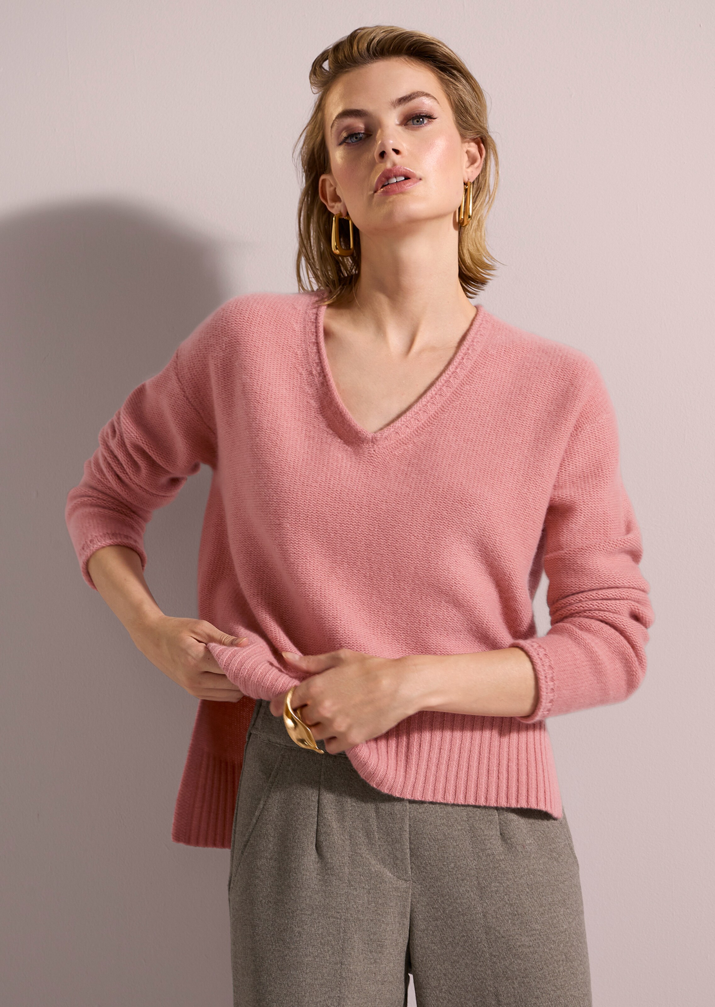 Fil luxueux doux et agréable sur la peau. Coupe décontractée tendance. Encolure en V, épaules descendues, manches longues et fentes latérales. Bords roulottés sur l'encolure et au bas des manches. Large empiècement en maille côtelée à la base et dos plus long.