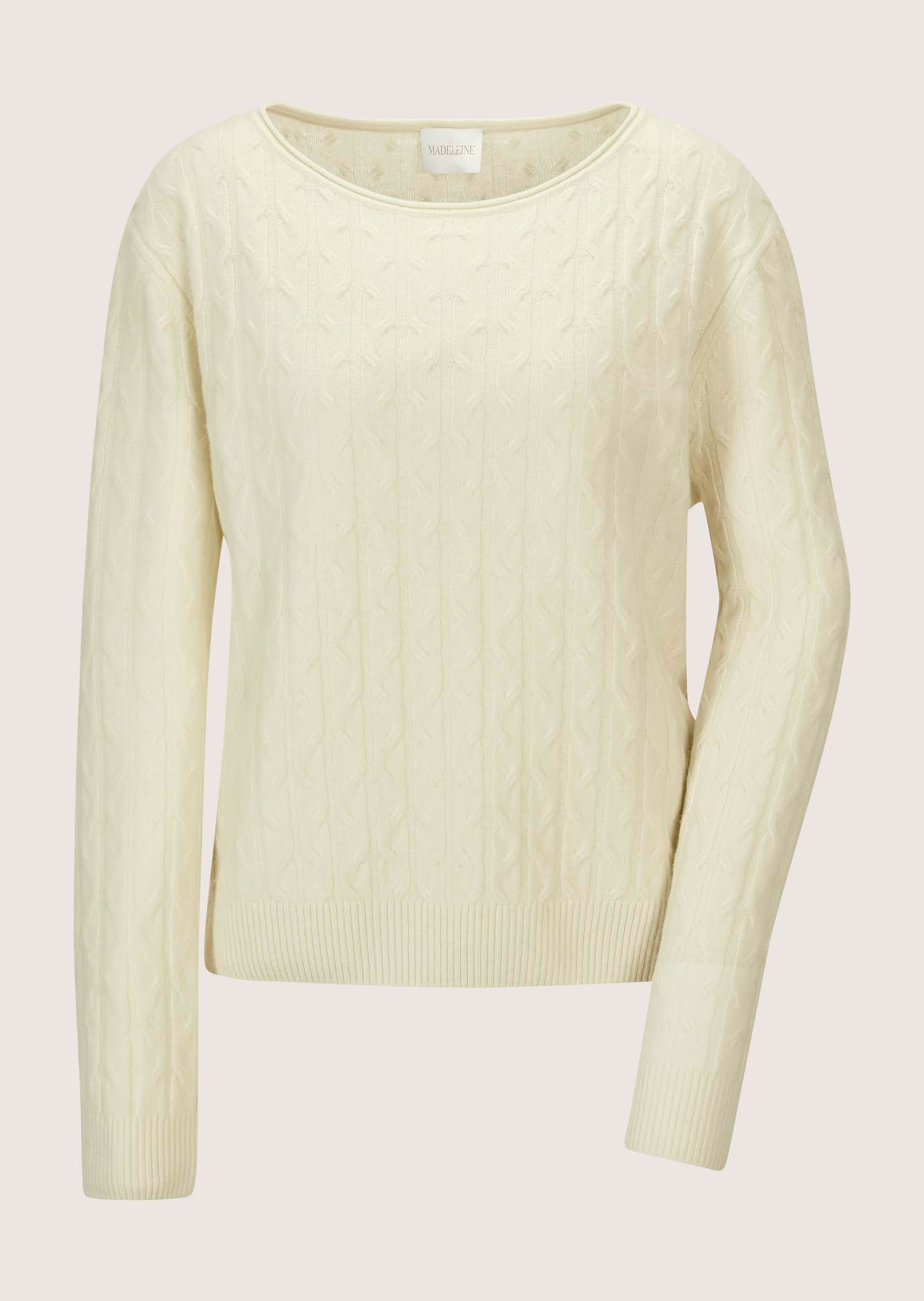 Fil naturel doux et agréable sur la peau. Fin motif torsadé. Bords-côtes d'une tenue irréprochable au bas des manches longues et à la base. Élégant bord roulotté sur l'encolure arrondie.