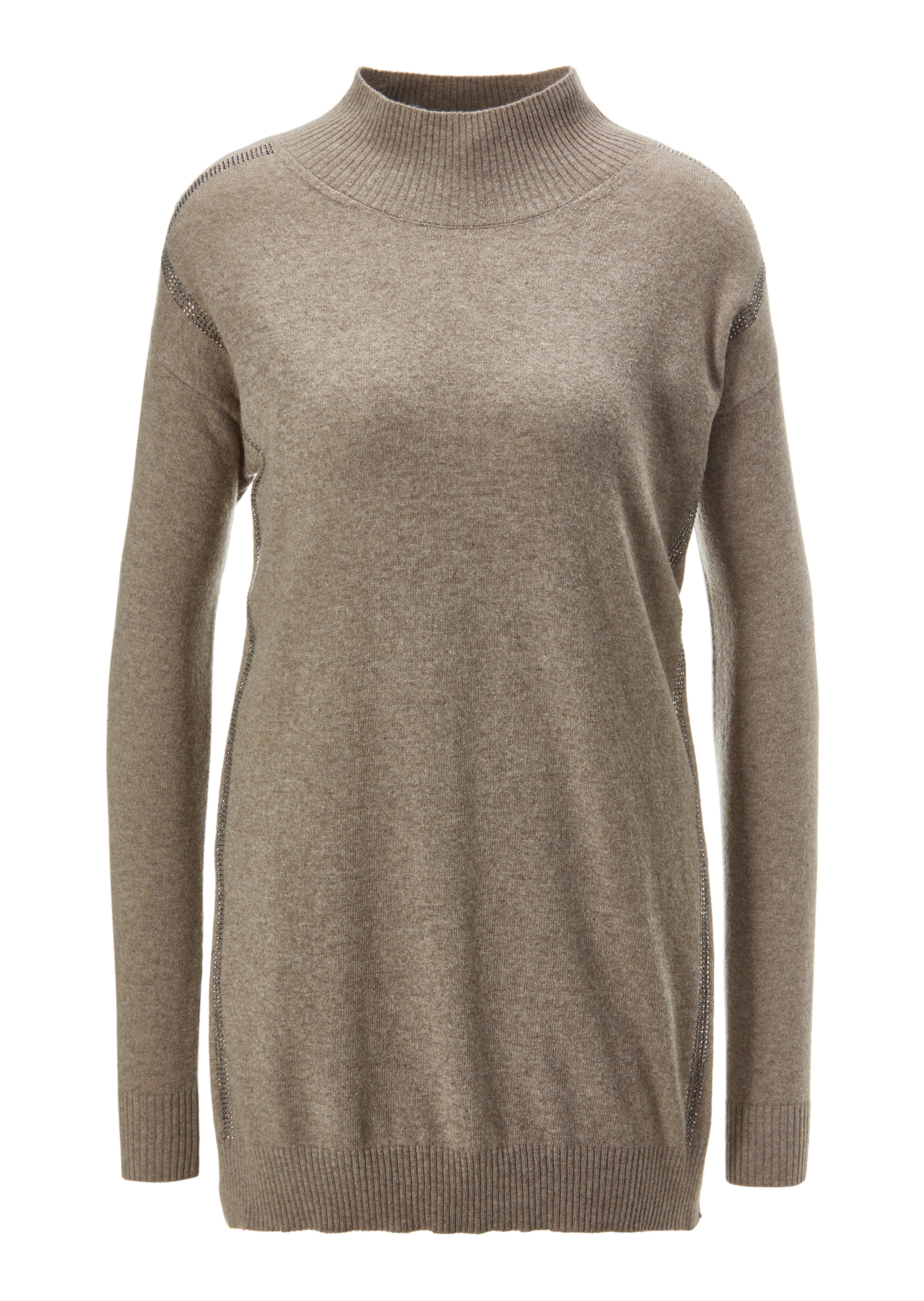 Pierres fantaisie sur les côtés du col montant jusqu'à la base. Coupe droite décontractée. Emmanchures descendues, manches longues et longues fentes latérales.