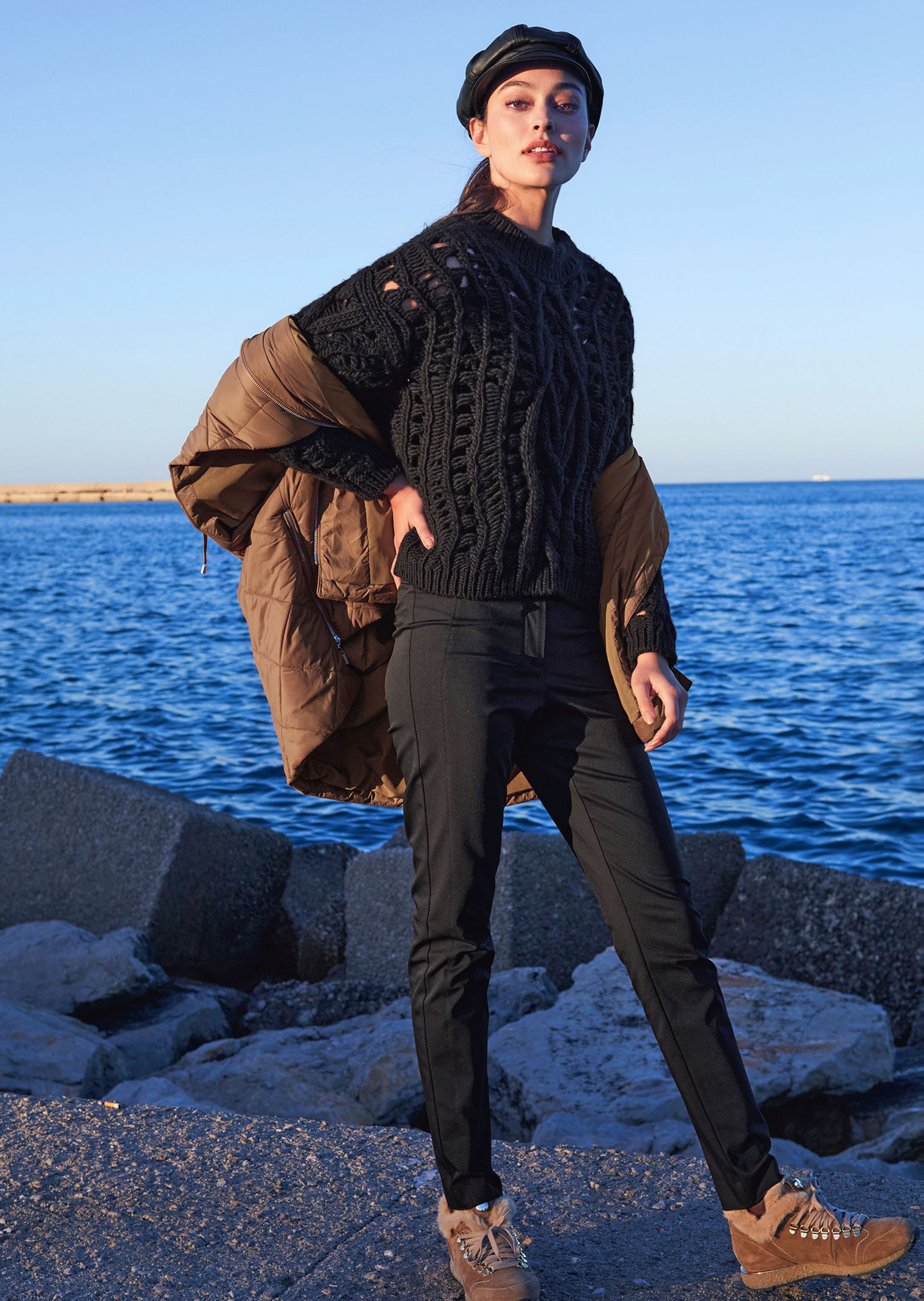 Élégant modèle en mailles lâches avec motif torsadé. Coupe boxy décontractée. Col montant en maille côtelée, épaules descendues, manches longues et bords-côtes.