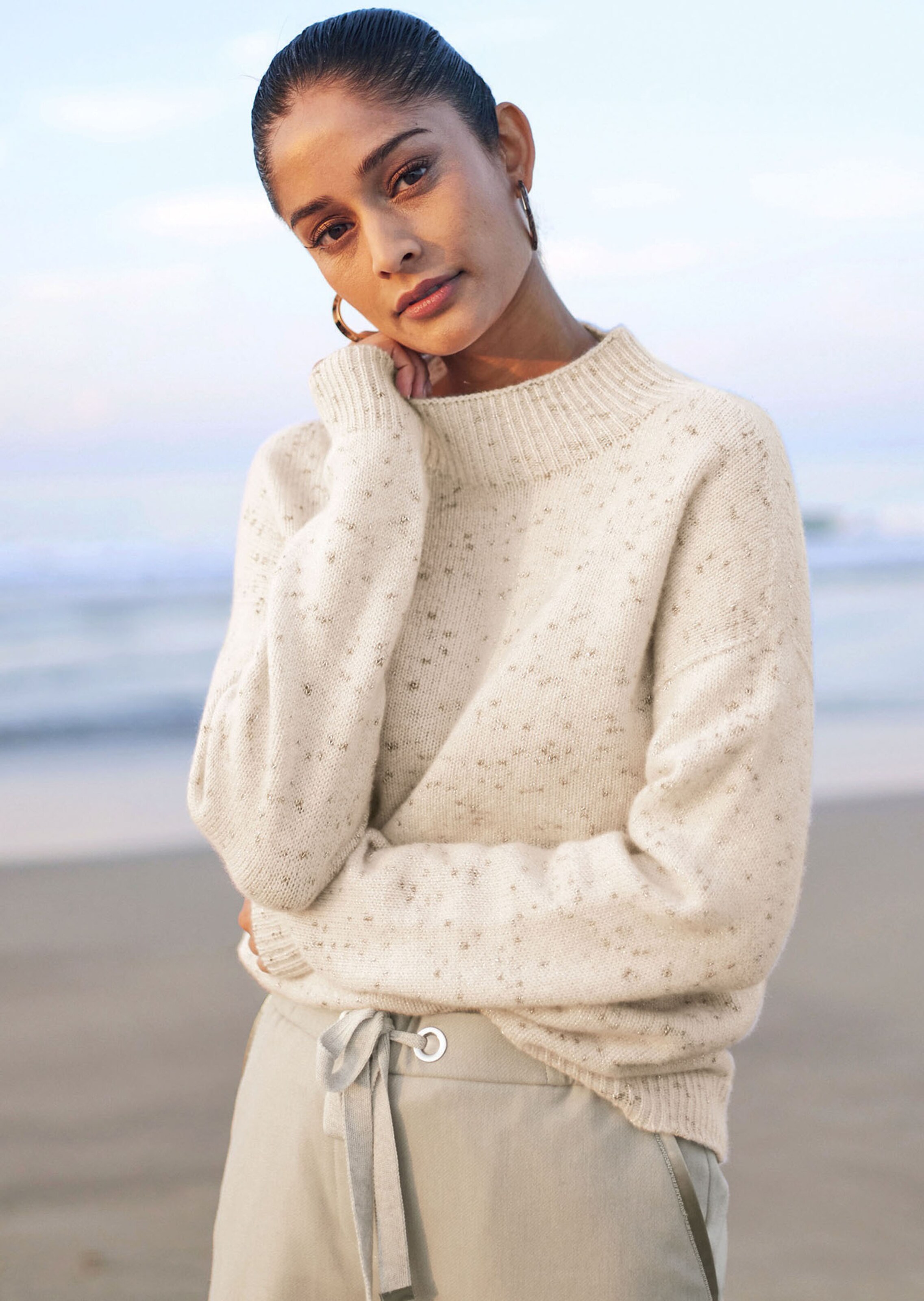 Laine italienne haut de gamme au léger effet brillant. Coupe décontractée. Col montant en maille côtelée, manches longues et épaules descendues.