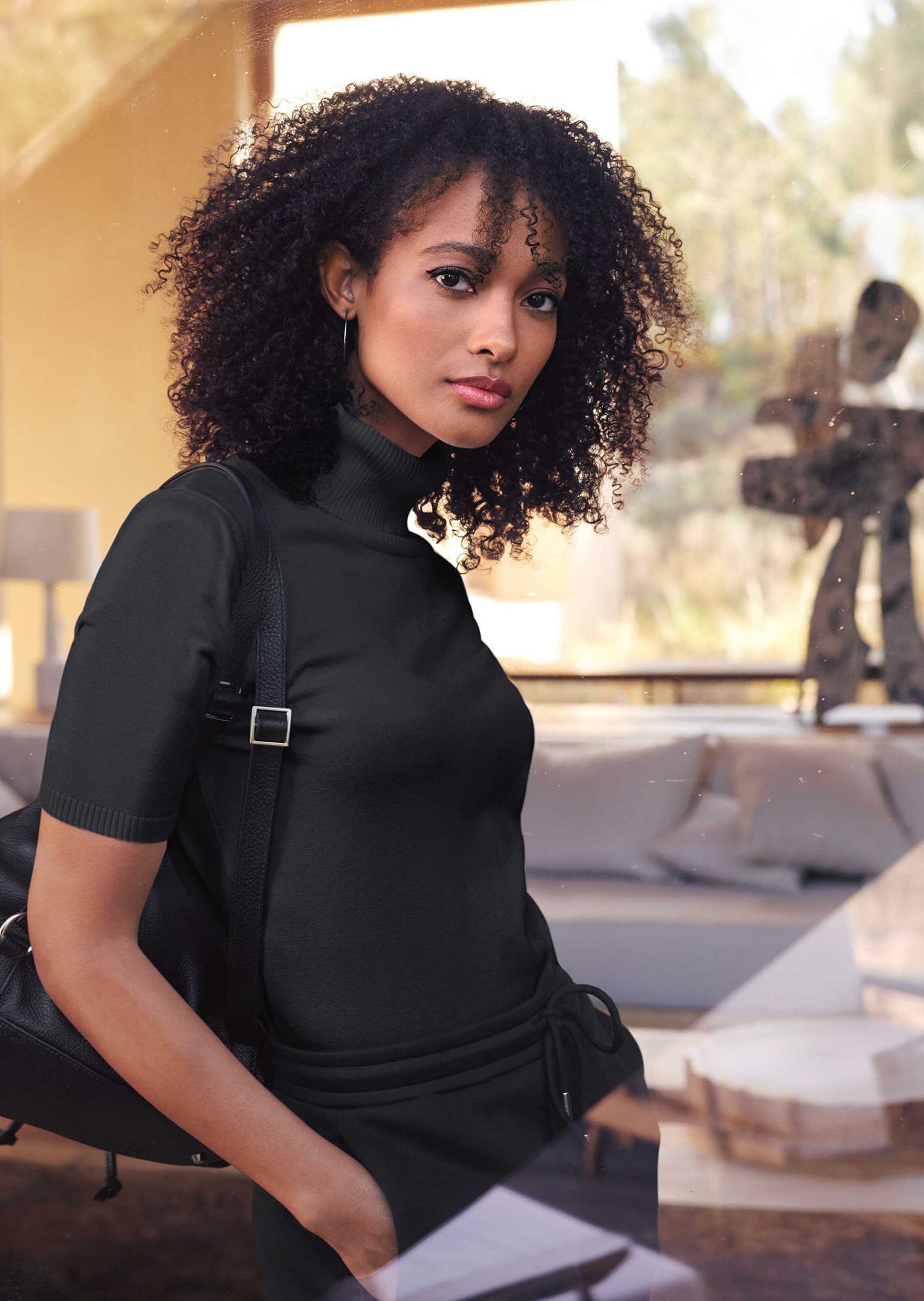Viscose souple et d'une tenue irréprochable. Col roulé classique à manches courtes.