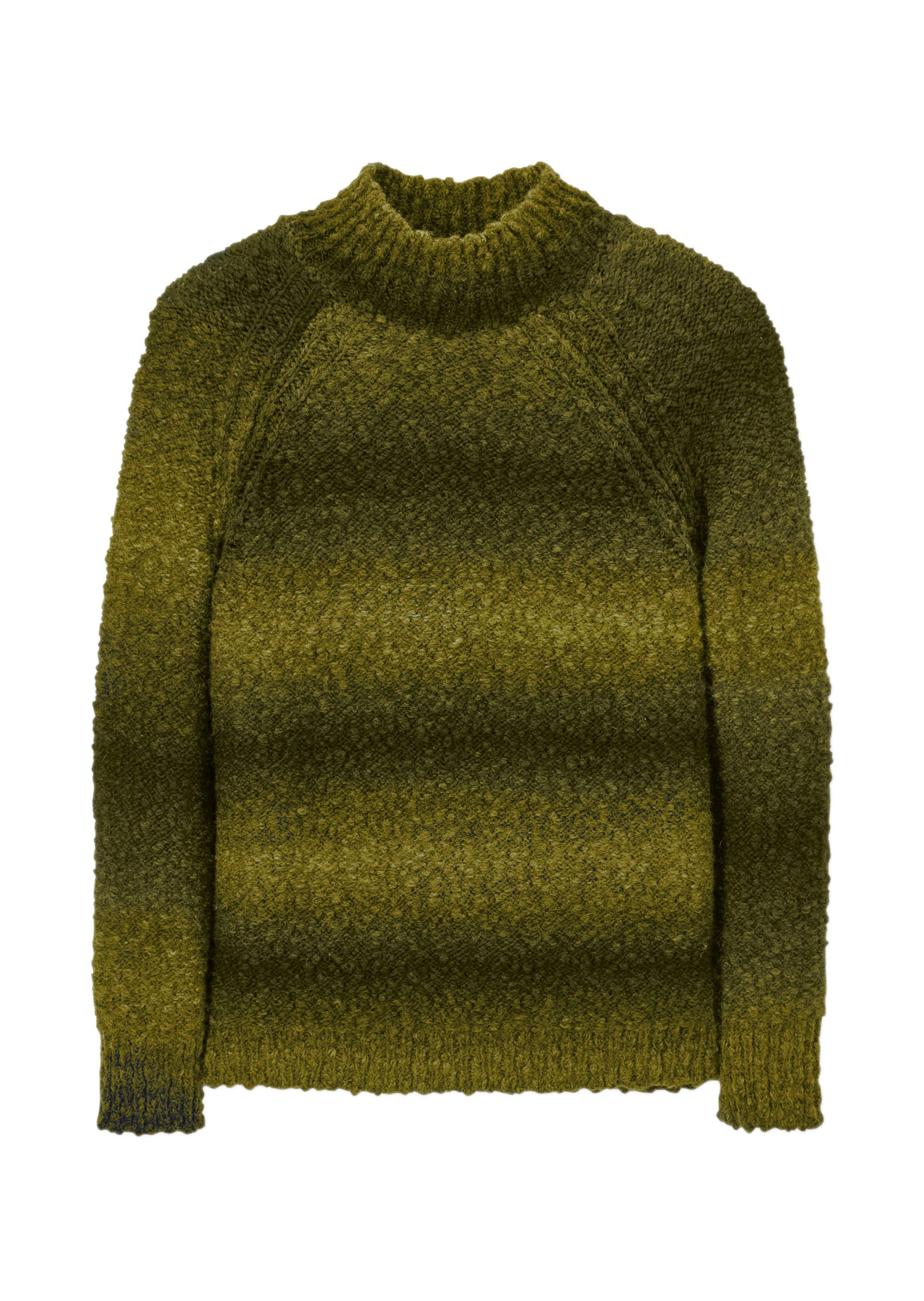 Structure dynamique et superbe dégradé de couleurs unique. Modèle douillet et décontracté. Col montant en maille côtelée et manches longues raglan. Bords-côtes au bas des manches et à la base.