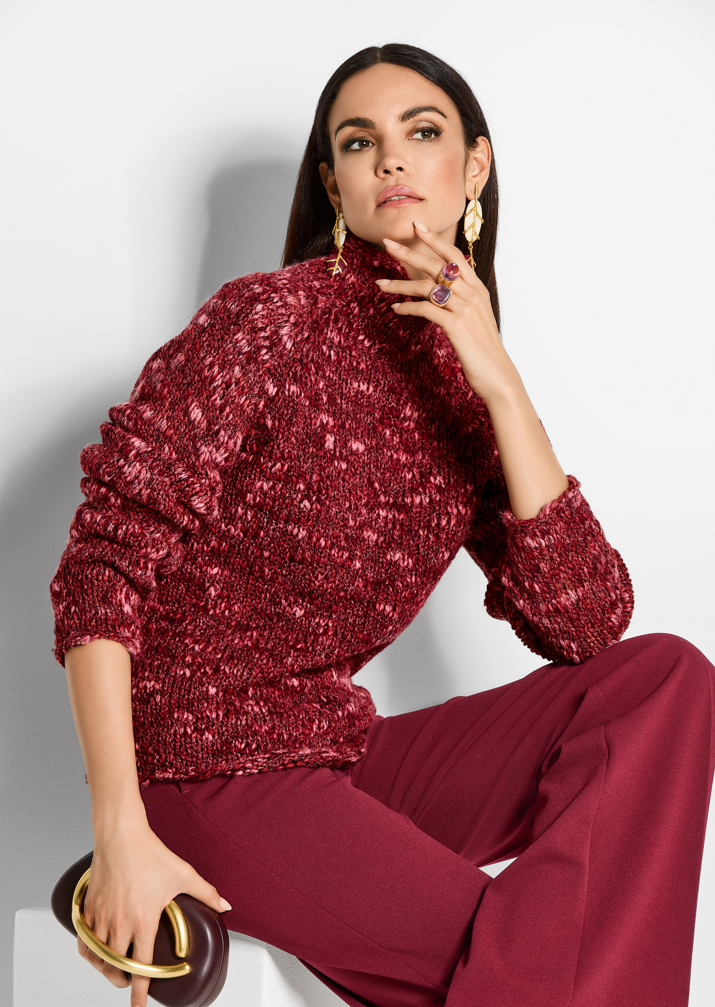 Sublime grosse maille en fil multicolore tendance. Coupe courte décontractée. Tricoté fully fashioned avec col montant et manches longues.
