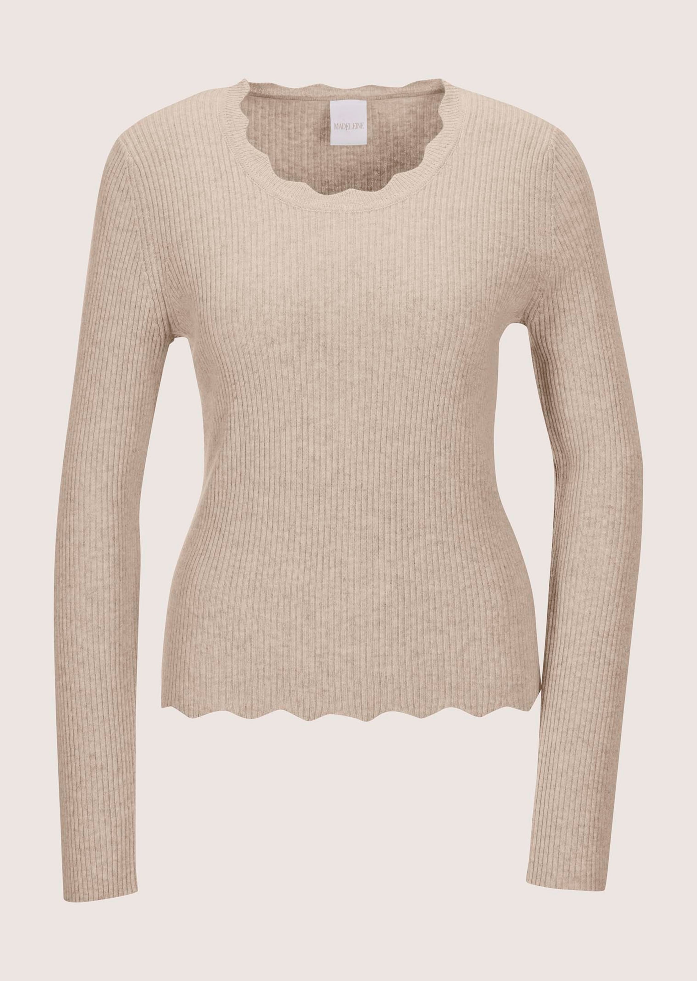 Fil mélangé doux et agréable sur la peau. Maille côtelée chic. Coupe courte cintrée et féminine. Bords ondulés sur l'encolure arrondie et à la base. Manches longues ajustées.