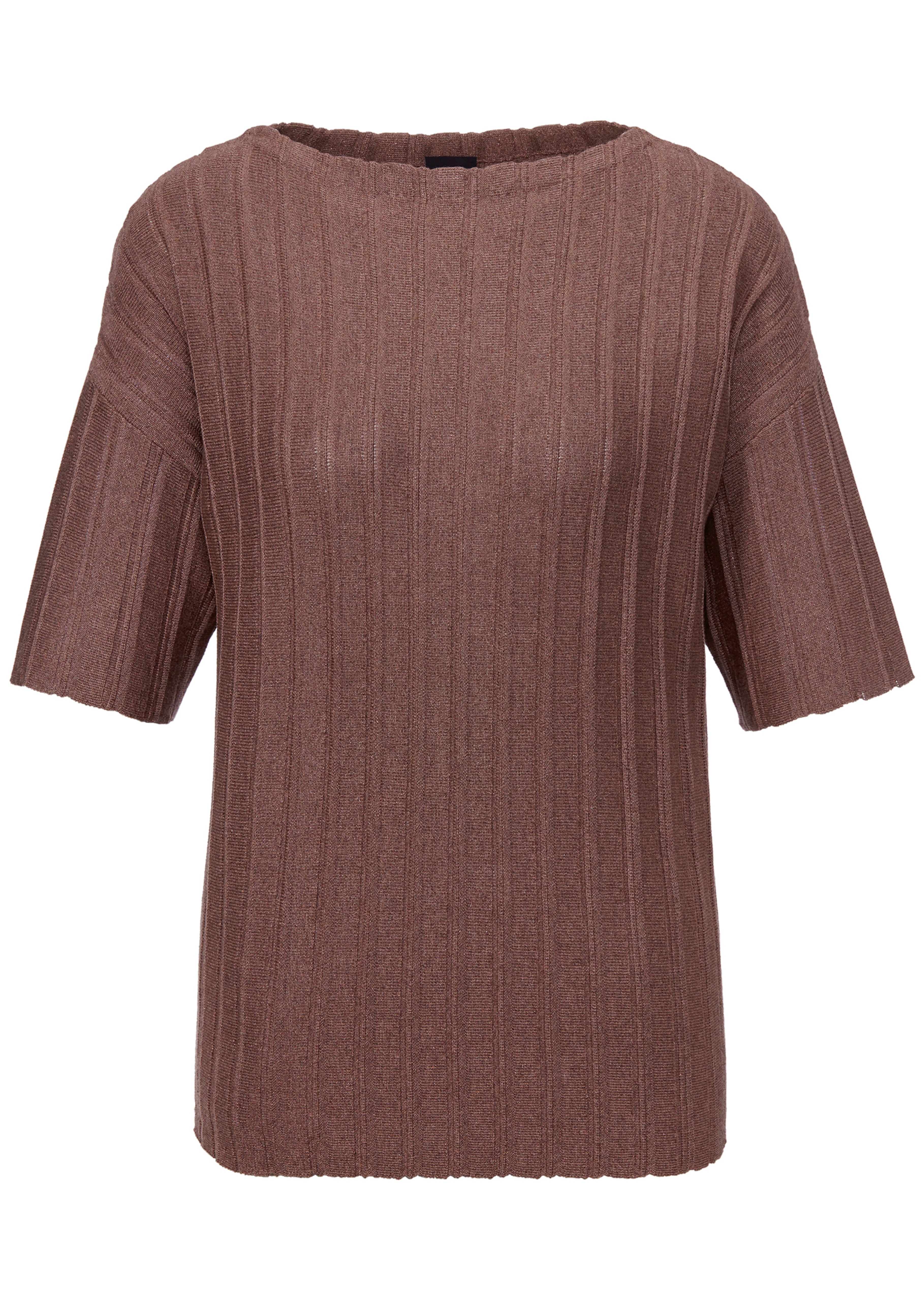 Coupe maxi actuelle. Fil fantaisie intégré apportant une touche de brillance. Maille agréable sur la peau à large structure côtelée. Encolure arrondie, emmanchures descendues et manches coude.