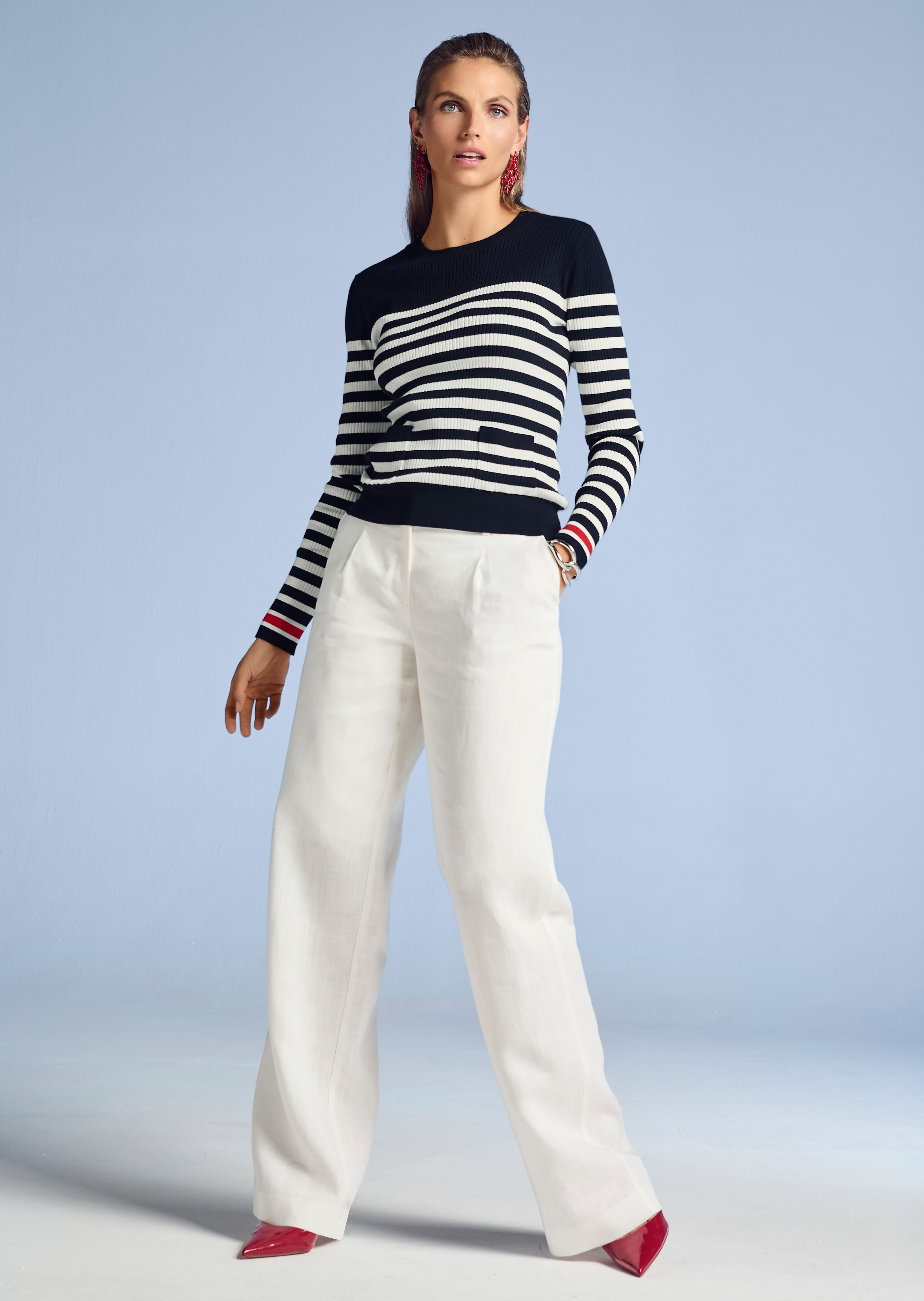 Ligne ajustée, fine maille côtelée à rayures, en viscose mélangée extensible. Encolure arrondie, poches plaquées et manches longues avec détails contrastants.