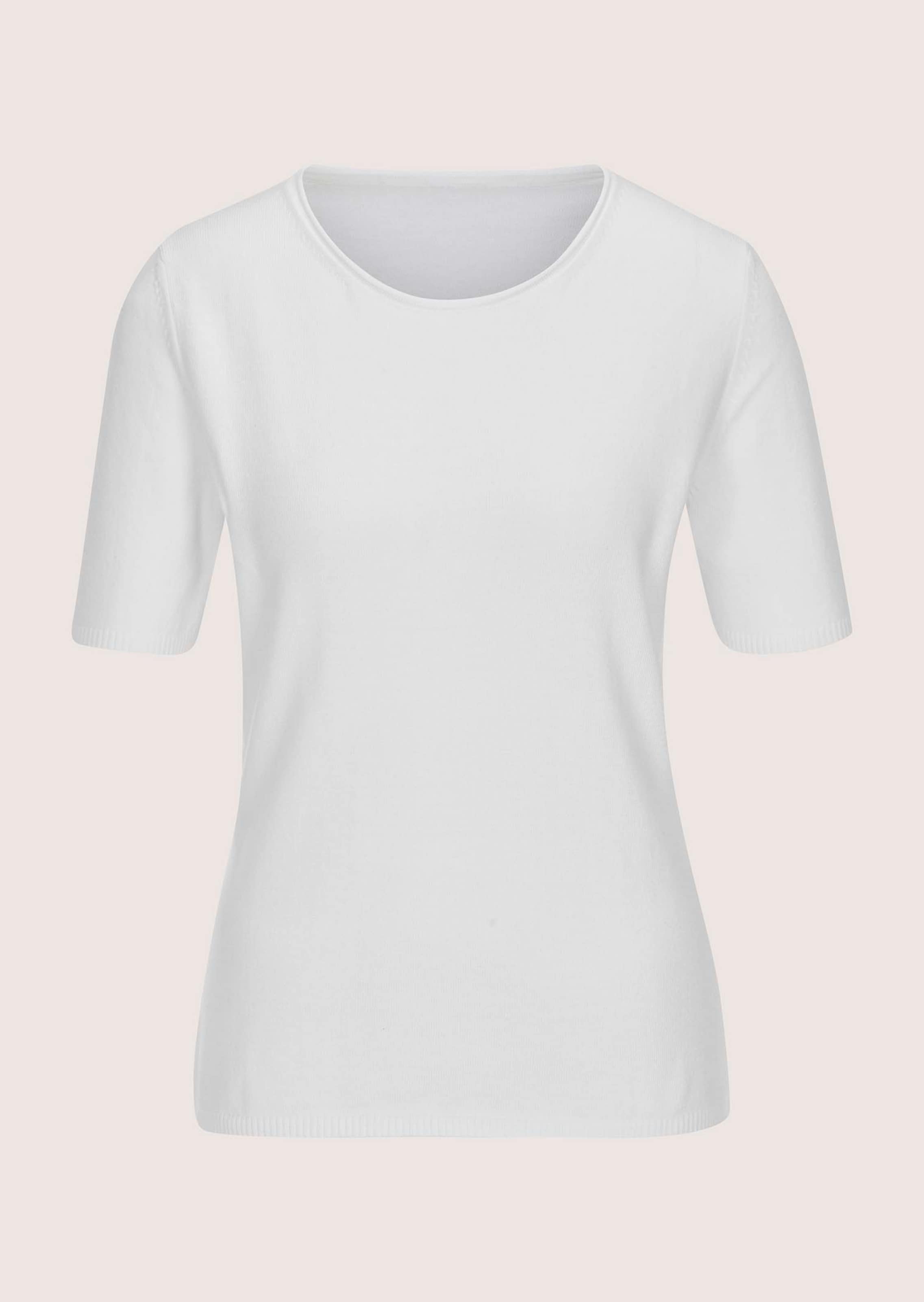 Pull très facile à styler, en fine maille jersey endroit douce et légère. Encolure arrondie avec fin bord roulotté et fins bords-côtes au bas des manches coudes et à la base.