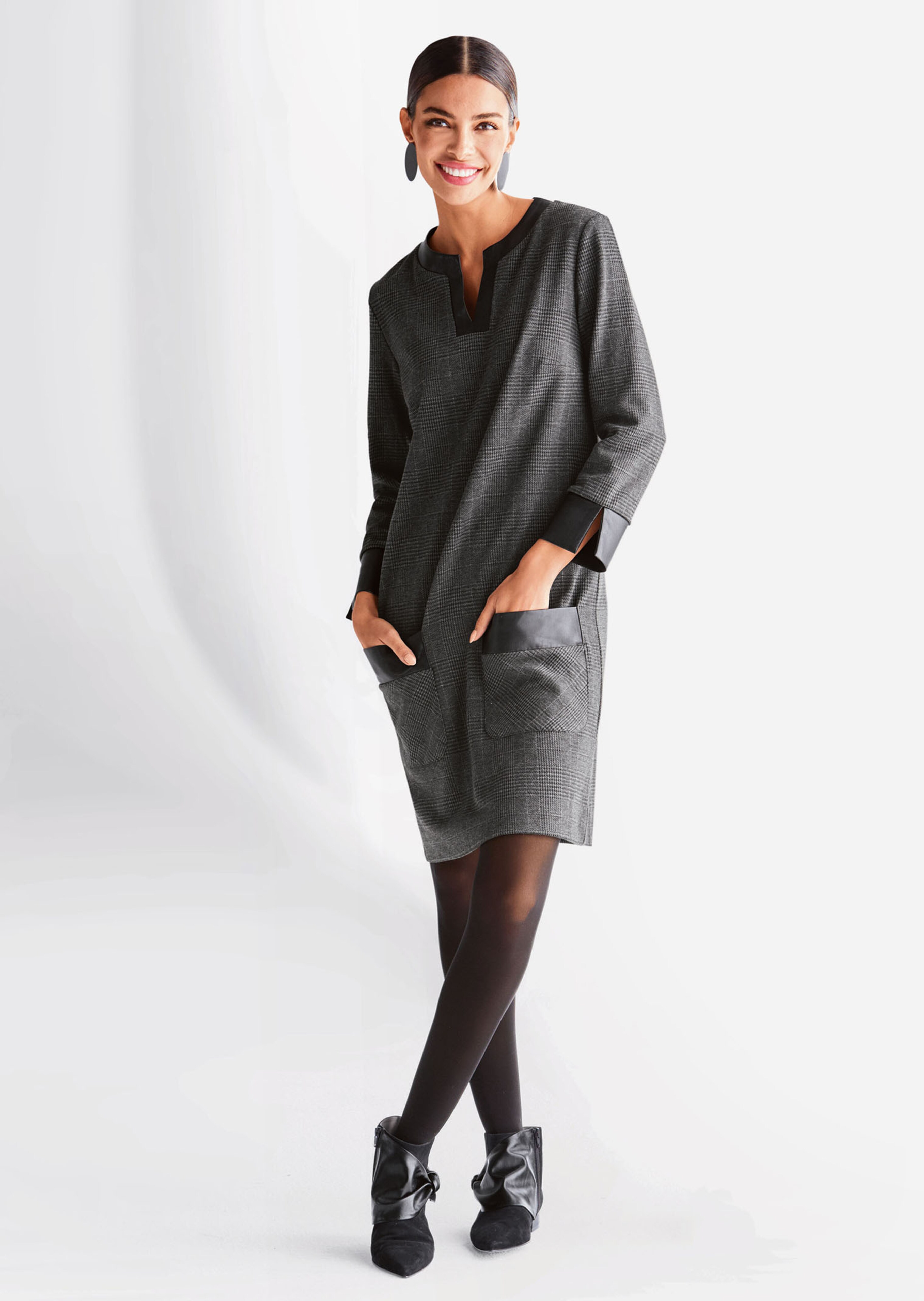 L'élégance décontractée. Esprit tendance, coupe droite mode. Matière synthétique à l'encolure, sur les poches et au bas des manches 3/4. Encolure arrondie avec découpe en V.