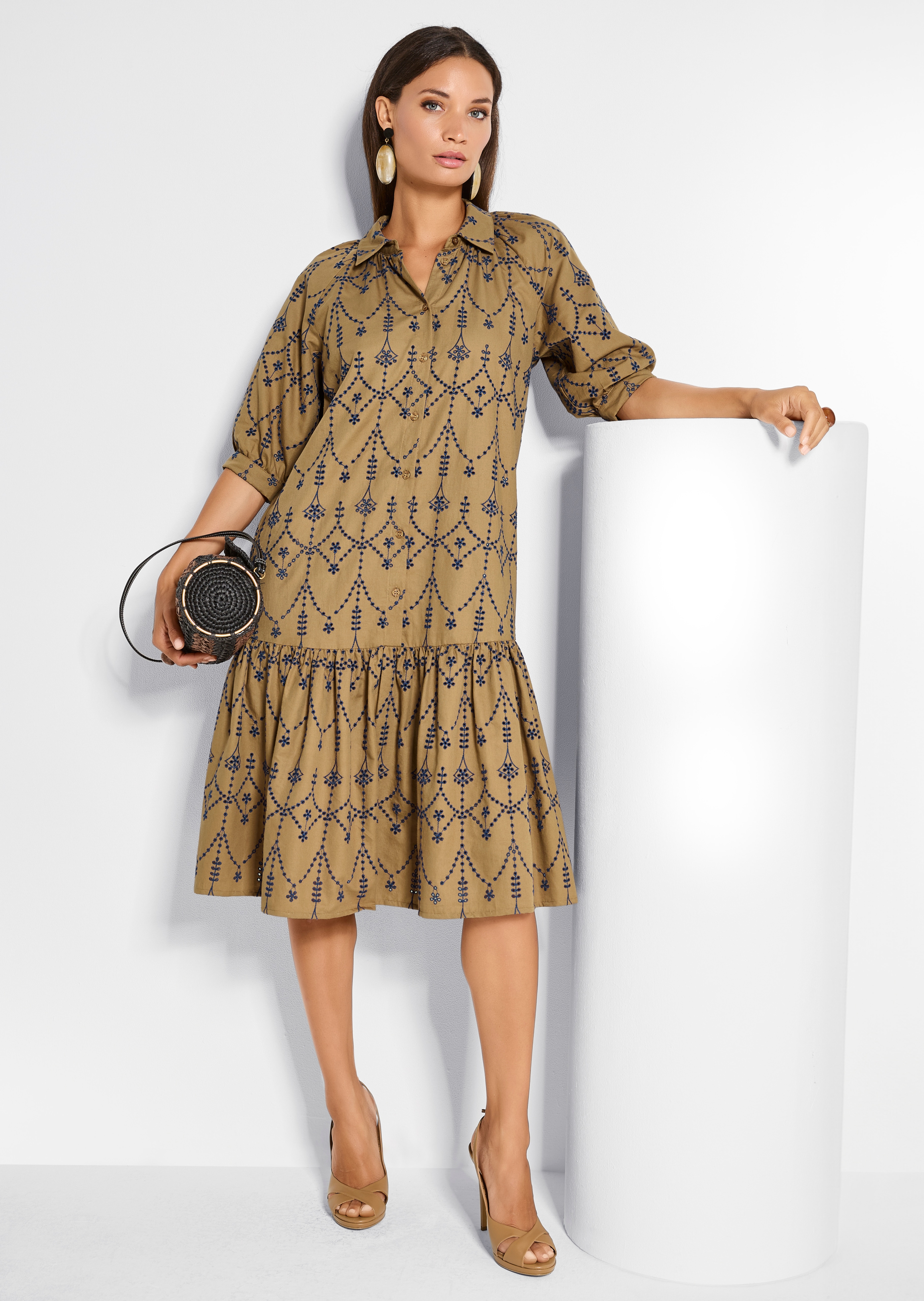 Légère et agréable, avec broderie ajourée et détails au style romantique. Col chemisier classique et bande de boutonnage jusqu'à la découpe. Petites fronces le long de l'encolure. Étage volanté sur la jupe. Larges manches coudes raglan élastiquées.